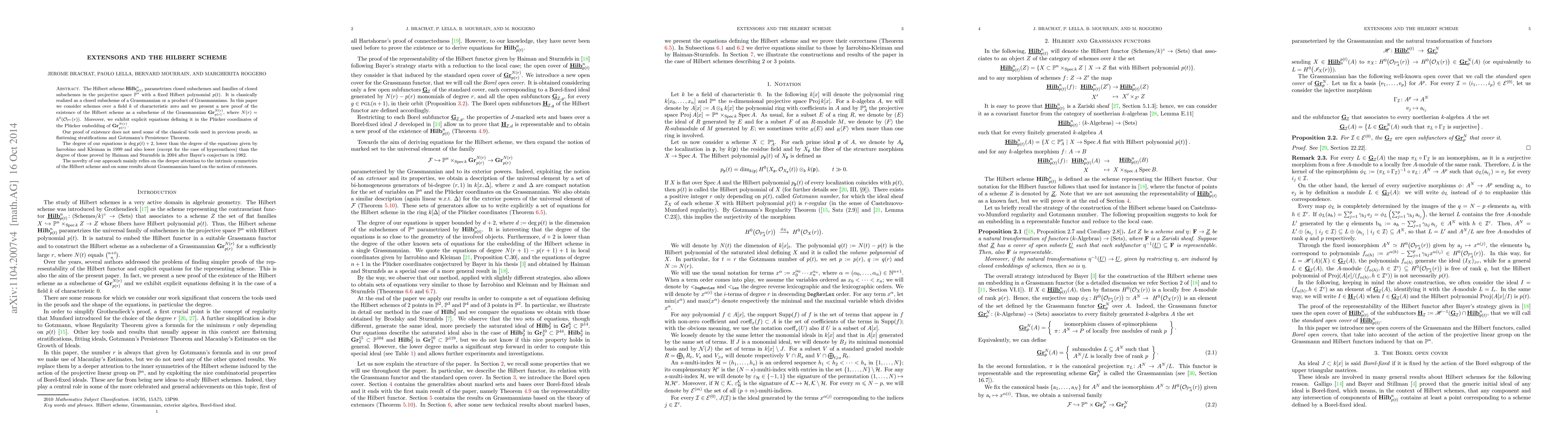 This paper presents a new proof for the existence of the Hilbert scheme as a subscheme of the Grassmannian, using explicit equations in Plucker coordinates. The degree of the equations is lower than previous results, relying on intrinsic symmetries and the concept of extensors instead of classical tools like flattening stratifications.
