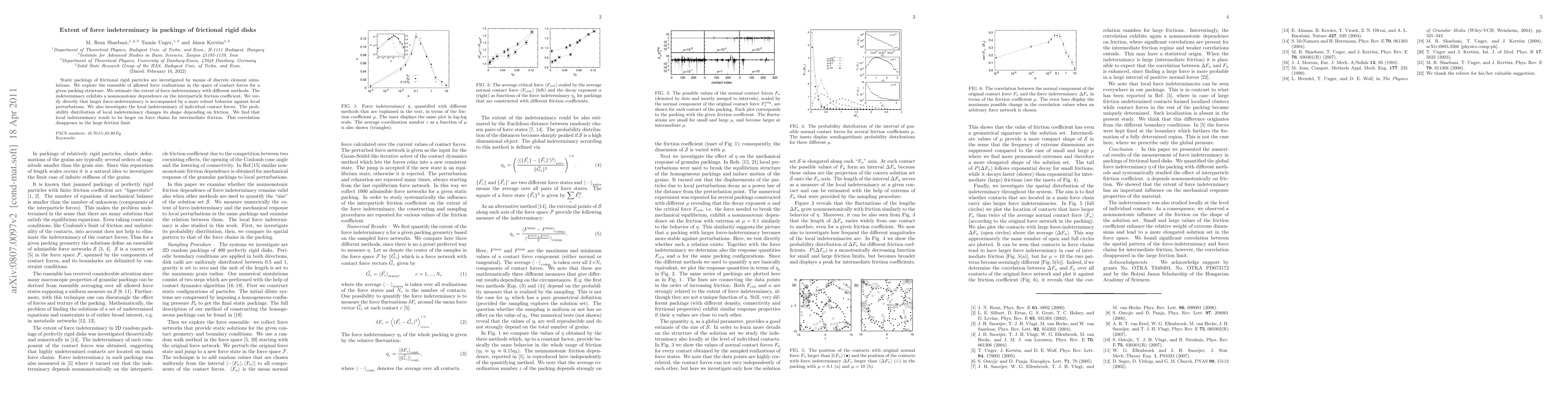 This paper investigates the force indeterminacy in static packings of frictional rigid disks using discrete element simulations. It finds that force indeterminacy, which increases with intermediate friction, correlates with enhanced robustness against local perturbations, while the probability distribution of local indeterminacy varies with friction, showing larger indeterminacy on force chains at intermediate friction.