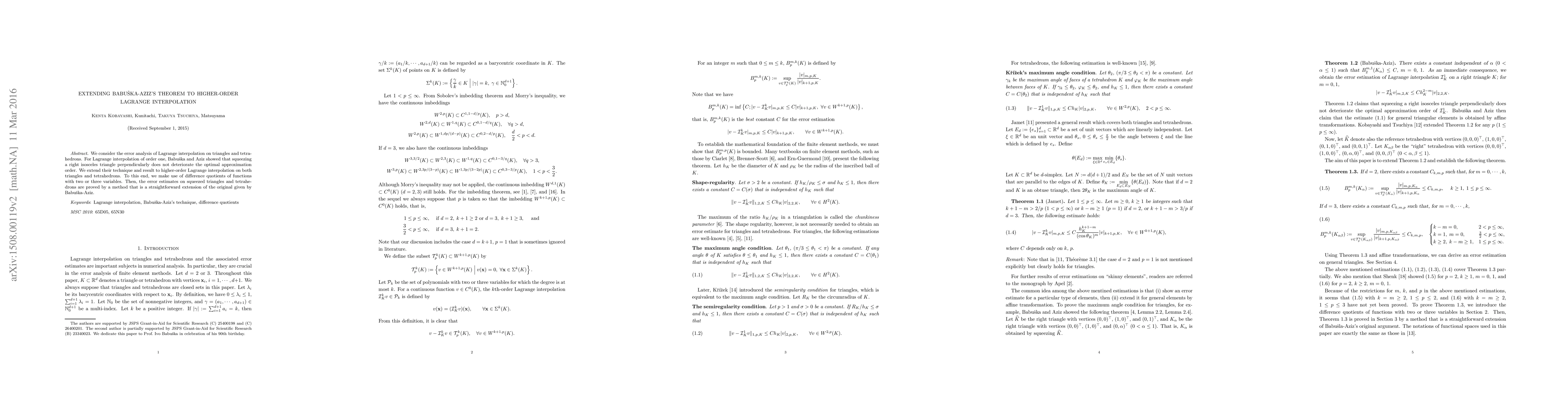 This paper extends Babuška and Aziz's theorem on optimal approximation order in Lagrange interpolation to higher-order interpolation on triangles and tetrahedrons. The authors utilize difference quotients for multivariable functions and extend the original error analysis method to prove the error estimates for squeezed geometric shapes.