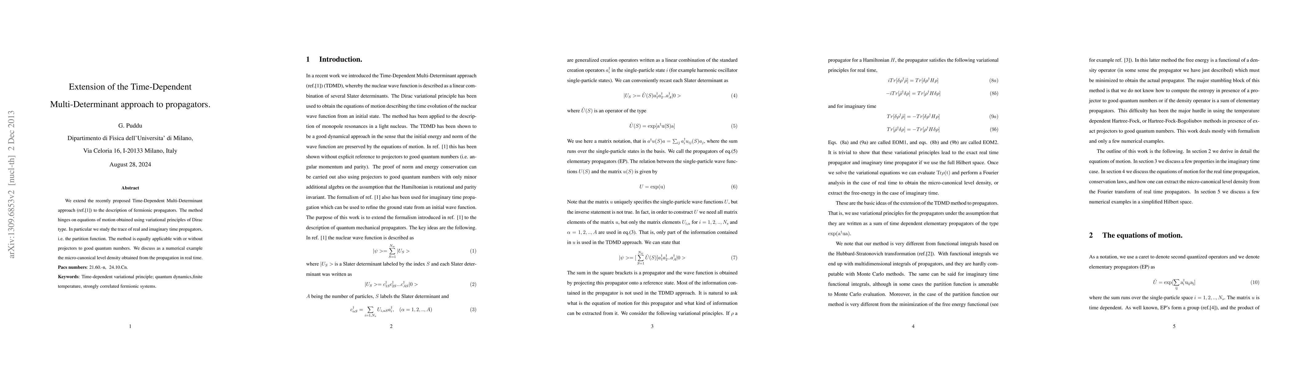 We extend the recently proposed Time-Dependent Multi-Determinant approach (ref.[1]) to the description of fermionic propagators. The method hinges on equations of motions obtained using variational principles of Dirac type. In particular we focus on traces of imaginary time propagators, i.e. the partition function. The method is equally applicable with or without projectors to good quantum numbers.