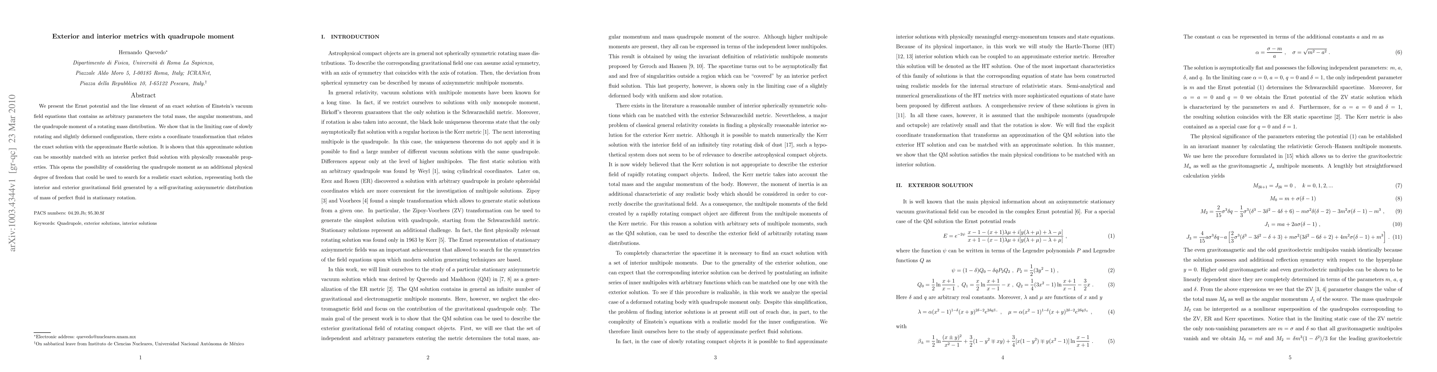 We present the Ernst potential and the line element of an exact solution of Einstein's vacuum field equations that contains as arbitrary parameters the total mass, the angular momentum, and the quadrupole moment of a rotating mass distribution. We show that in the limiting case of slowly rotating and slightly deformed configuration, there exists a coordinate transformation that relates the exact solution with the approximate Hartle solution. It is shown that this approximate solution can be smoothly matched with an interior perfect fluid solution with physically reasonable properties. This opens the possibility of considering the quadrupole moment as an additional physical degree of freedom that could be used to search for a realistic exact solution, representing both the interior and exterior gravitational field generated by a self-gravitating axisymmetric distribution of mass of perfect fluid in stationary rotation.