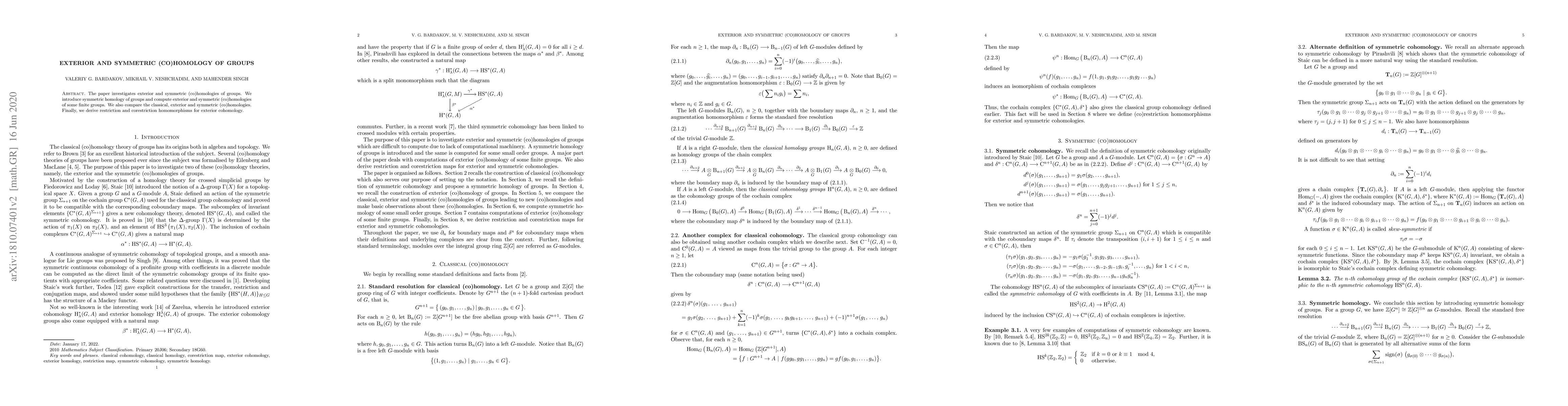 The paper investigates exterior and symmetric (co)homologies of groups. We introduce symmetric homology of groups and compute exterior and symmetric (co)homologies of some finite groups. We also compare the classical, exterior and symmetric (co)homologies. Finally, we derive restriction and corestriction homomorphisms for exterior cohomology
