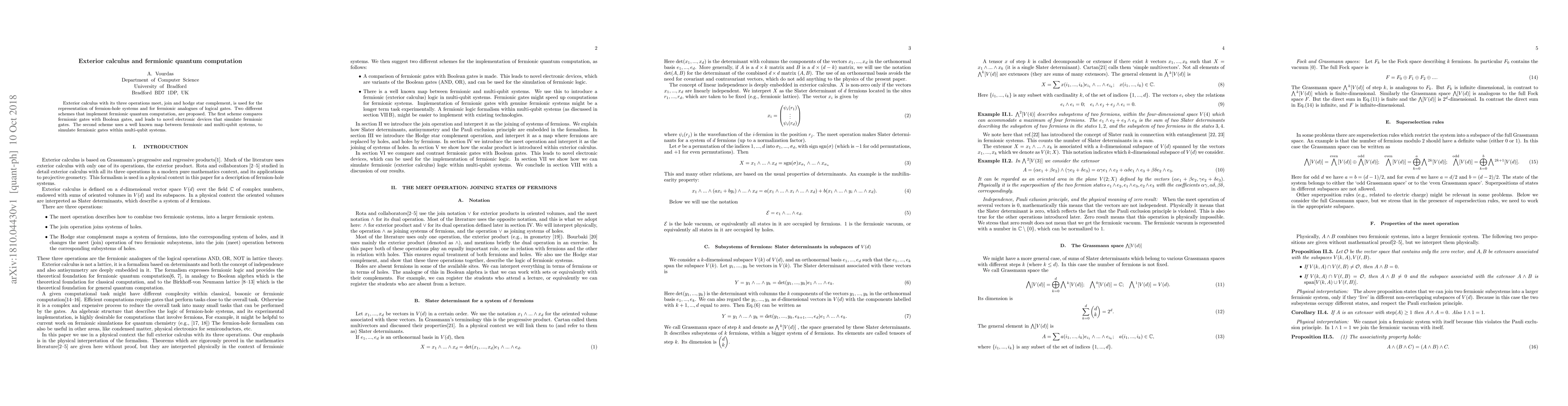 Exterior calculus with its three operations meet, join and hodge star complement, is used for the representation of fermion-hole systems and for fermionic analogues of logical gates. Two different schemes that implement fermionic quantum computation, are proposed. The first scheme compares fermionic gates with Boolean gates, and leads to novel electronic devices that simulate fermionic gates. The second scheme usesa well known map between fermionic and multi-qubit systems, to simulate fermionic gates within multi-qubit systems.