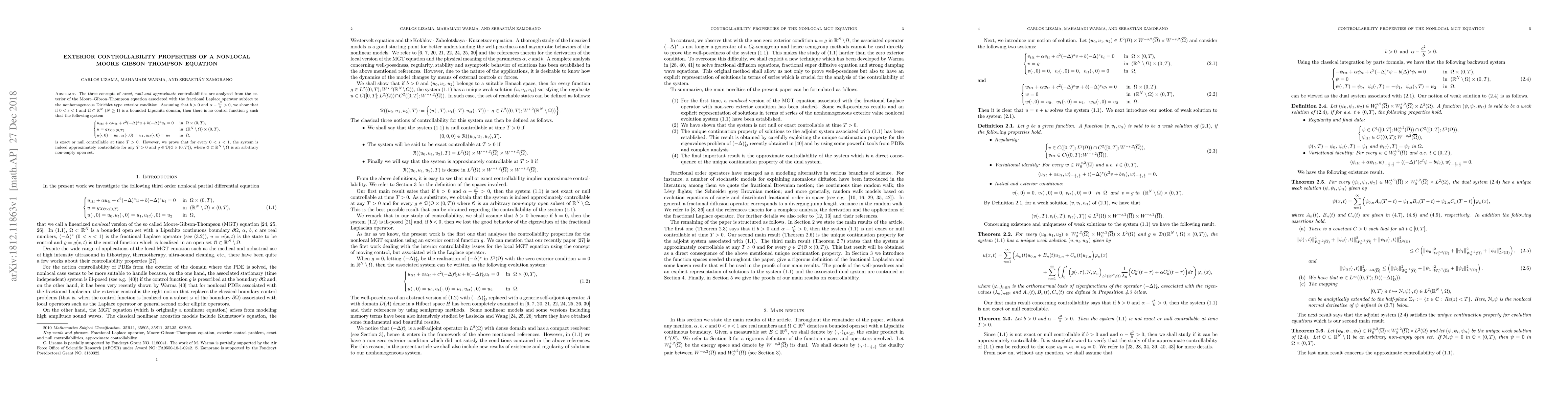 The three concepts of exact, null and approximate controllabilities are analyzed from the exterior of the Moore--Gibson--Thompson equation associated with the fractional Laplace operator subject to the nonhomogeneous Dirichlet type exterior condition.