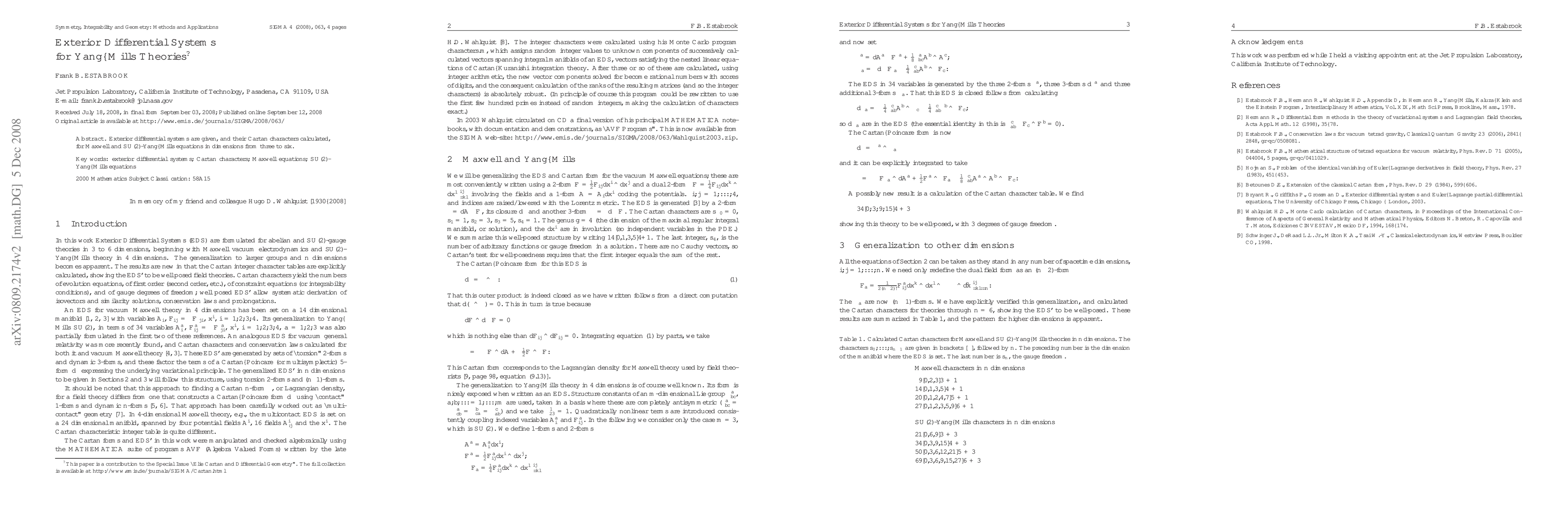 Researchers used exterior differential systems to analyze Maxwell and SU(2)-Yang-Mills equations in dimensions 3-6, finding their Cartan characters.