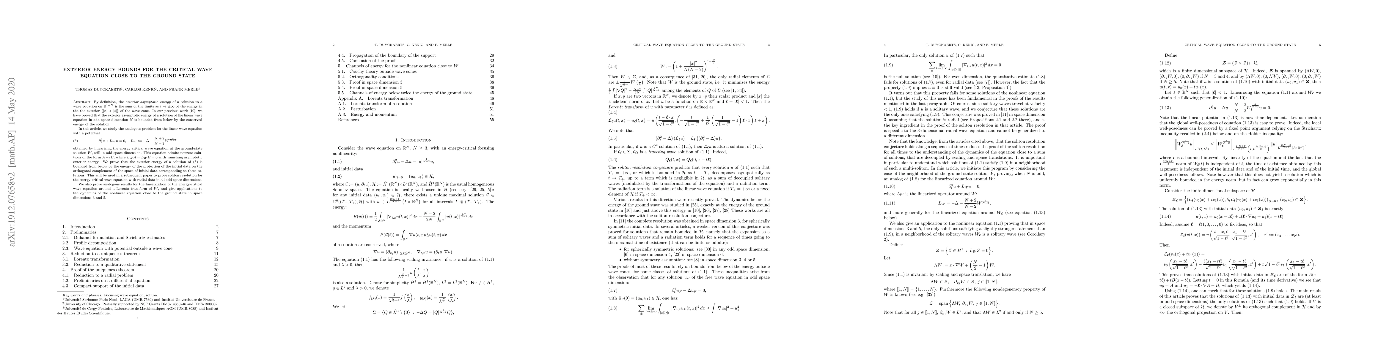 This paper investigates the exterior energy bounds for the critical wave equation near the ground state, proving that the exterior asymptotic energy of solutions to the linearized wave equation with a potential is bounded below by the energy of the initial data's orthogonal complement. These results are foundational for subsequent studies on soliton resolution and the dynamics of the nonlinear equation in odd dimensions.