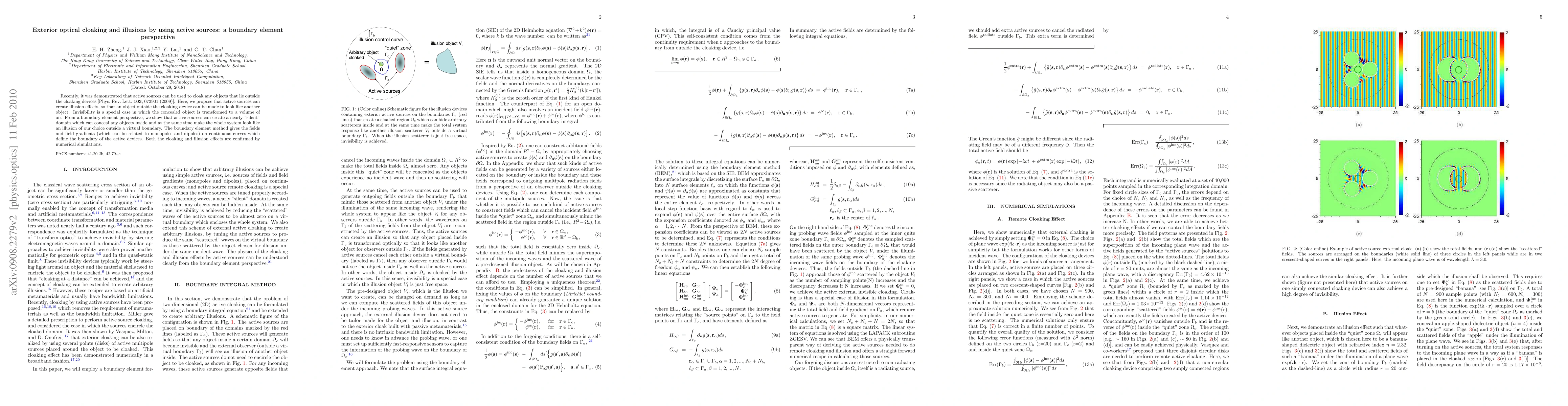 Recently, it was demonstrated that active sources can be used to cloak any objects that lie outside the cloaking devices [Phys. Rev. Lett. \textbf{103}, 073901 (2009)]. Here, we propose that active sources can create illusion effects, so that an object outside the cloaking device can be made to look like another object. invisibility is a special case in which the concealed object is transformed to a volume of air. From a boundary element perspective, we show that active sources can create a nearly "silent" domain which can conceal any objects inside and at the same time make the whole system look like an illusion of our choice outside a virtual boundary. The boundary element method gives the fields and field gradients (which can be related to monopoles and dipoles) on continuous curves which define the boundary of the active devices. Both the cloaking and illusion effects are confirmed by numerical simulations.