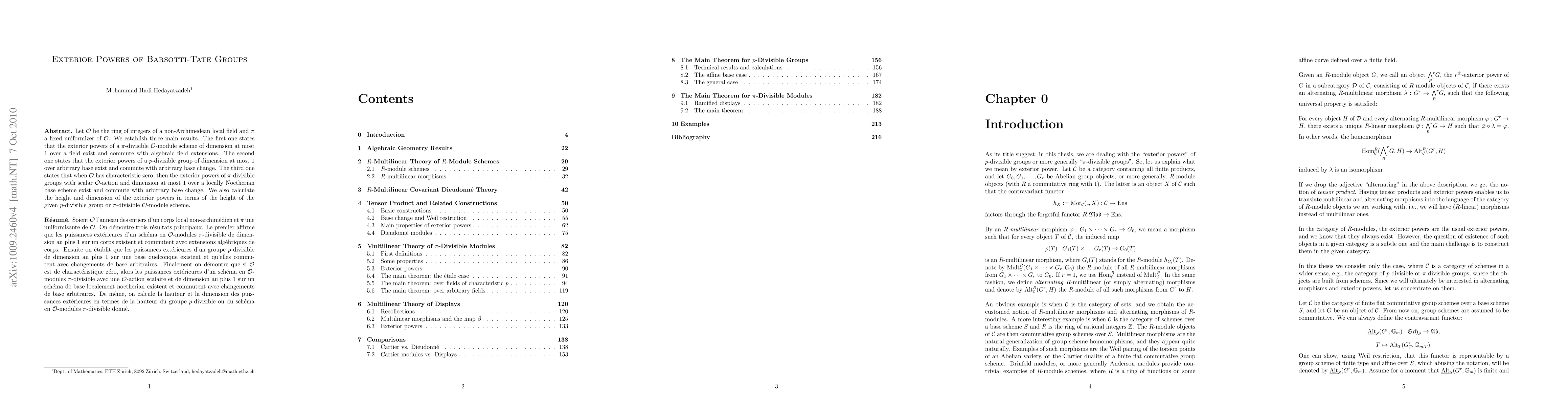 This paper establishes the existence and commutativity of exterior powers for $ \pi $-divisible $ \CO $-module schemes and $p$-divisible groups of dimension at most 1, with calculations of their height and dimension. The results extend to various base changes and field extensions.