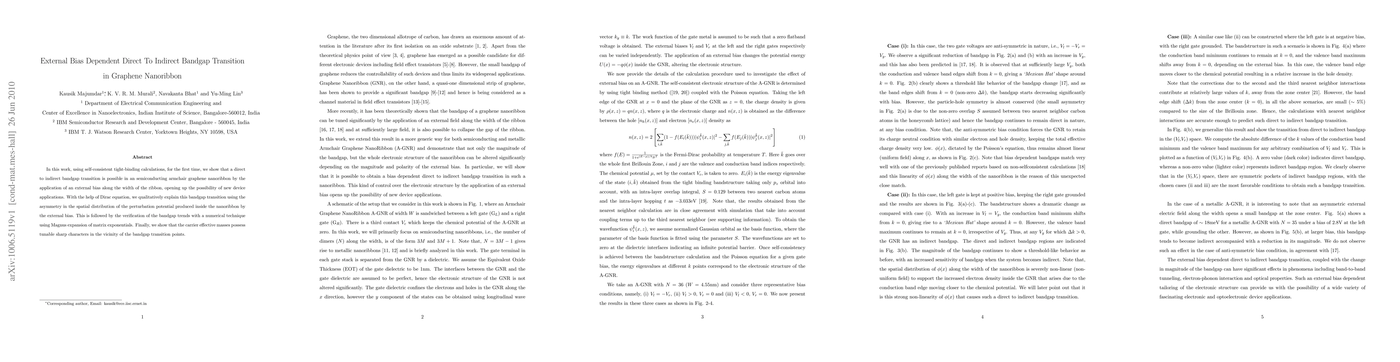 This research demonstrates a direct-to-indirect bandgap transition in armchair graphene nanoribbons via external bias, using self-consistent tight-binding calculations and Dirac equation analysis. The findings suggest potential for novel device applications and tunable carrier effective masses near transition points.