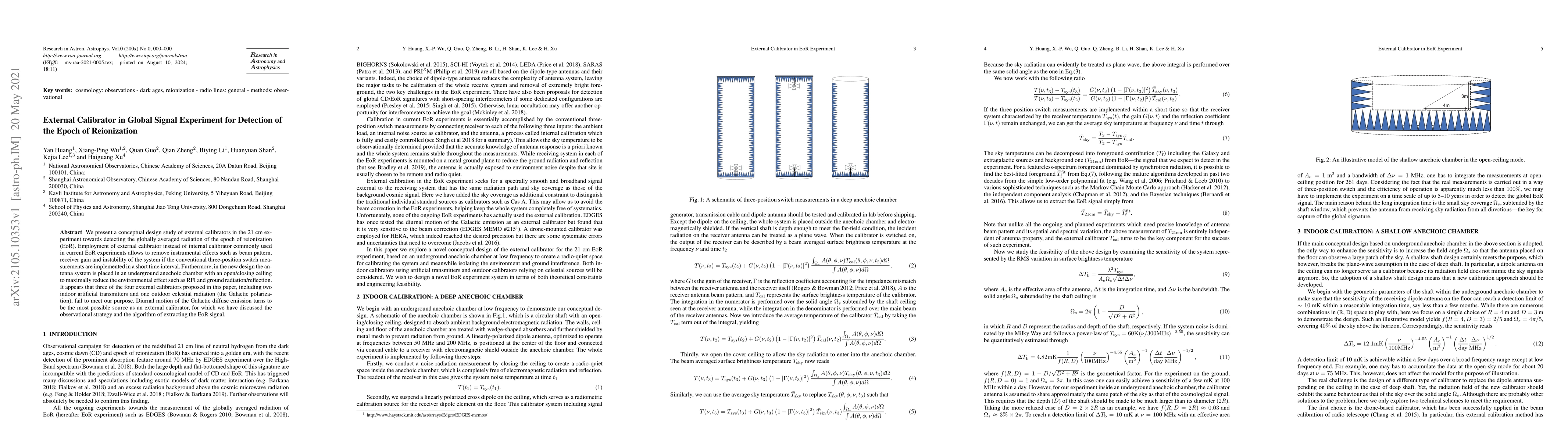 We present a conceptual design study of external calibrators in the 21 cm experiment towards detecting the globally averaged radiation of the epoch of reionization (EoR). Employment of external calibrator instead of internal calibrator commonly used in current EoR experiments allows to remove instrumental effects such as beam pattern, receiver gain and instability of the system if the conventional three-position switch measurements are implemented in a short time interval. Furthermore, in the new design the antenna system is placed in an underground anechoic chamber with an open/closing ceiling to maximally reduce the environmental effect such as RFI and ground radiation/reflection. It appears that three of the four external calibrators proposed in this paper, including two indoor artificial transmitters and one outdoor celestial radiation (the Galactic polarization), fail to meet our purpose. Diurnal motion of the Galactic diffuse emission turns to be the most possible source as an external calibrator, for which we have discussed the observational strategy and the algorithm of extracting the EoR signal.