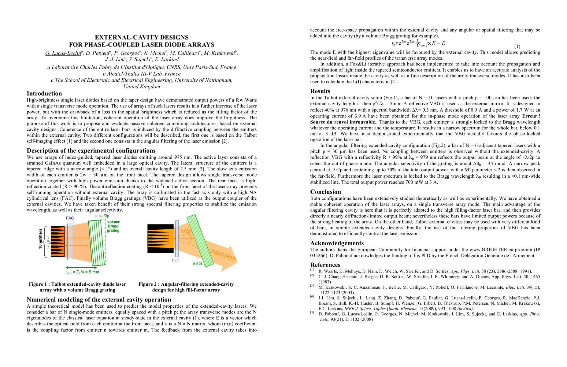 We describe passive phase-locking architectures based on external-cavity setups to improve the brightness of diode laser bars. Volume Bragg gratings are used to stabilize the lase line. Numerical modelling and experimental results will be presented.