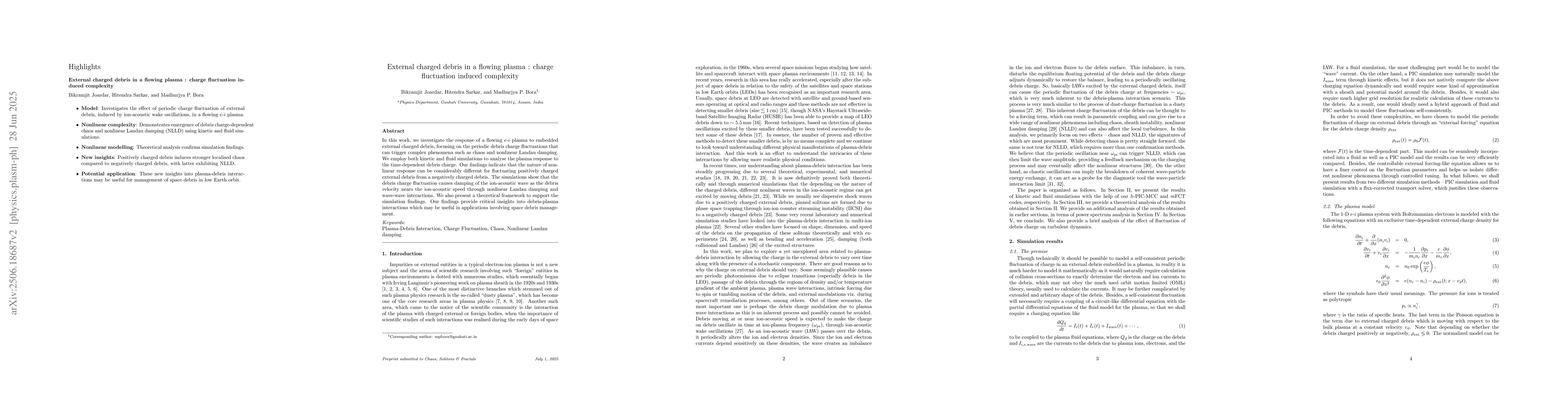 In this work, we investigate the response of a flowing e-i plasma to embedded external charged debris, focusing on the periodic debris charge fluctuations that can trigger complex phenomena such as chaos and nonlinear Landau damping. We employ both kinetic and fluid simulations to analyse the plasma response to the time-dependent debris charge. Our findings indicate that the nature of the nonlinear response can be considerably different for fluctuating positively charged external debris from negatively charged debris. The simulations show that the debris charge fluctuation causes damping of the ion-acoustic wave as the debris velocity nears the ion-acoustic speed through nonlinear Landau damping and wave-wave interactions. We also present a theoretical framework to support the simulation findings. Our findings provide critical insights into debris-plasma interactions, which may be useful in applications involving space debris management.