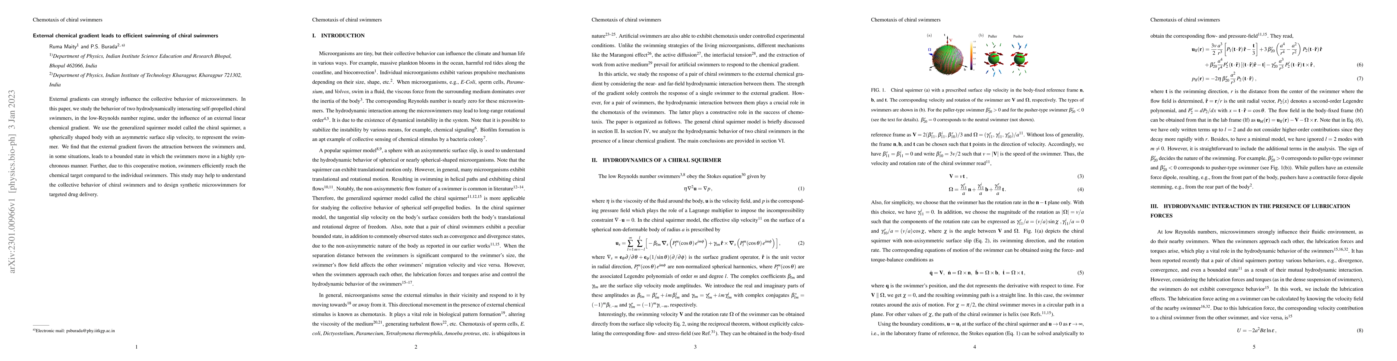 External gradients can strongly influence the collective behavior of microswimmers. In this paper, we study the behavior of two hydrodynamically interacting self-propelled chiral swimmers, in the low-Reynolds number regime, under the influence of an external linear chemical gradient. We use the generalized squirmer model called the chiral squirmer, a spherically shaped body with an asymmetric surface slip velocity, to represent the swimmer. We find that the external gradient favors the attraction between the swimmers and, in some situations, leads to a bounded state in which the swimmers move in a highly synchronous manner. Further, due to this cooperative motion, swimmers efficiently reach the chemical target compared to the individual swimmers. This study may help to understand the collective behavior of chiral swimmers and to design synthetic microswimmers for targeted drug delivery.