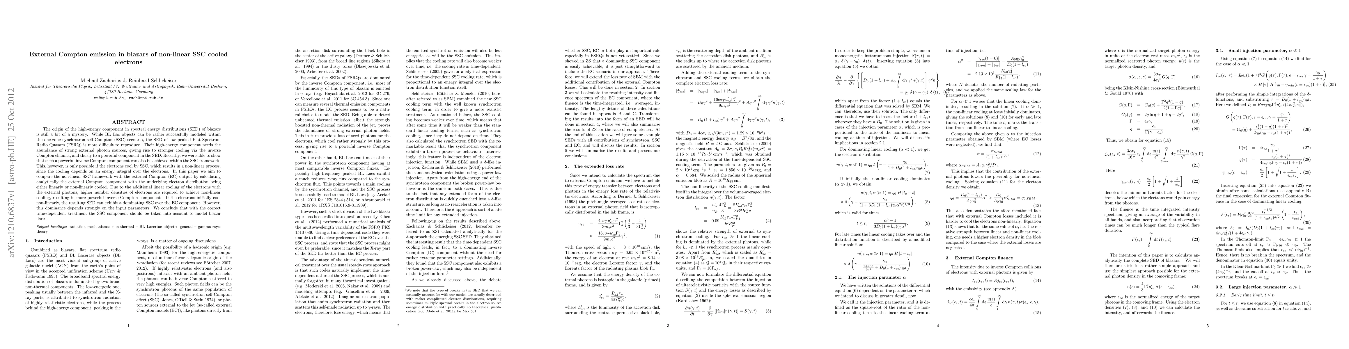 The origin of the high-energy component in spectral energy distributions (SED) of blazars is still a bit of a mystery. While BL Lac objects can be rather successfully modelled within the one-zone synchrotron self-Compton (SSC) scenario, the SED of low peaked Flat Spectrum Radio Quasars (FSRQ) is more difficult to reproduce. Their high-energy component needs the abundance of strong external photon sources, giving rise to stronger cooling via the inverse Compton channel, and thusly to a powerful component in the SED. Recently, we were able to show that such a powerful inverse Compton component can also be achieved within the SSC framework. This, however, is only possible if the electrons cool by SSC, which results in a non-linear process, since the cooling depends on an energy integral over the electrons. In this paper we aim to compare the non-linear SSC framework with the external Compton (EC) output by calculating analytically the external Compton component with the underlying electron distribution being either linearly or non-linearly cooled. Due to the additional linear cooling of the electrons with the external photons, higher number densities of electrons are required to achieve non-linear cooling, resulting in more powerful inverse Compton components. If the electrons initially cool non-linearly, the resulting SED can exhibit a dominating SSC over the EC component. However, this dominance depends strongly on the input parameters. We conclude that with the correct time-dependent treatment the SSC component should be taken into account to model blazar flares.