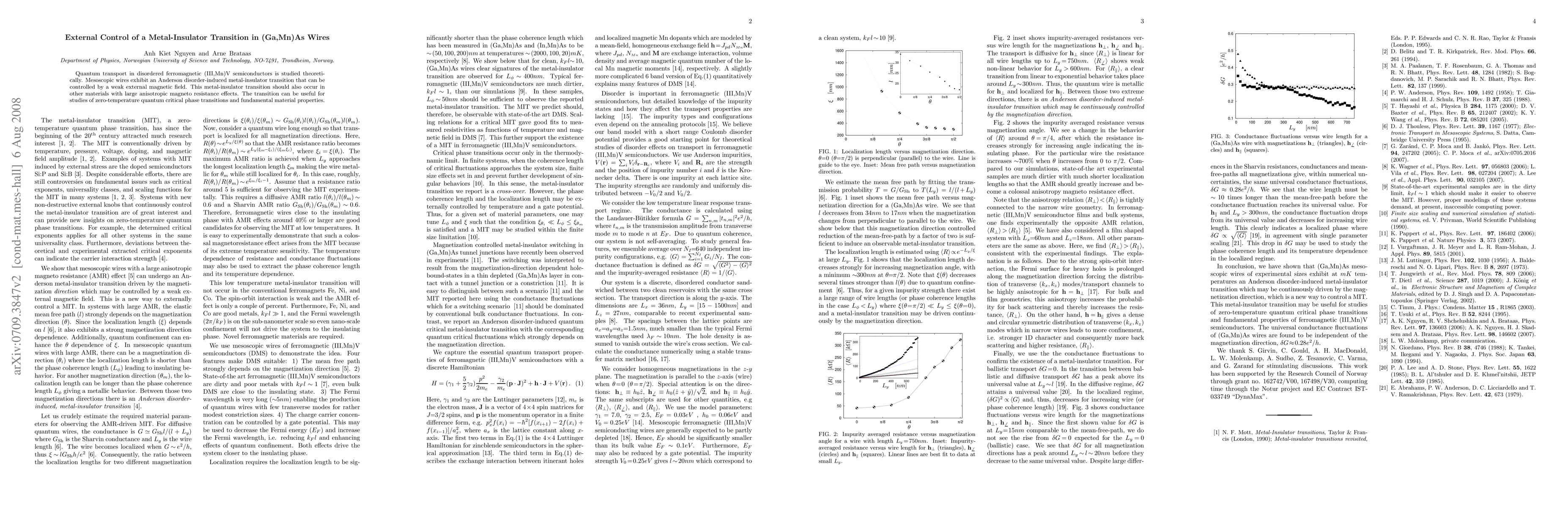 This paper investigates quantum transport in disordered ferromagnetic GaMnAs wires, demonstrating that an external magnetic field can control an Anderson disorder-induced metal-insulator transition. This transition is significant for studying zero-temperature quantum critical phase transitions and fundamental material properties.