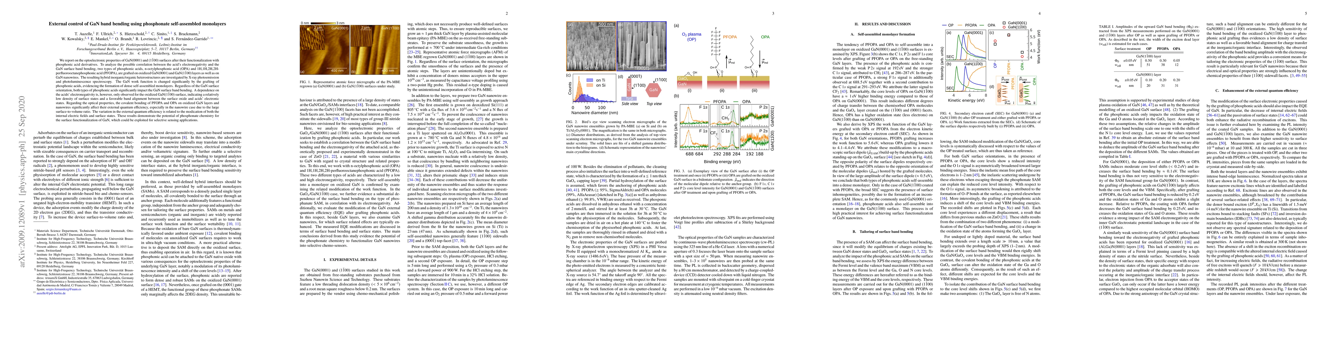 We report on the optoelectronic properties of GaN$(0001)$ and $(1\bar{1}00)$ surfaces after their functionalization with phosphonic acid derivatives. To analyze the possible correlation between the acid's electronegativity and the GaN surface band bending, two types of phosphonic acids, n-octylphosphonic acid (OPA) and 1H,1H,2H,2H-perfluorooctanephosphonic acid (PFOPA), are grafted on oxidized GaN$(0001)$ and GaN$(1\bar{1}00)$ layers as well as on GaN nanowires. The resulting hybrid inorganic/organic heterostructures are investigated by X-ray photoemission and photoluminescence spectroscopy. The GaN work function is changed significantly by the grafting of phosphonic acids, evidencing the formation of dense self-assembled monolayers. Regardless of the GaN surface orientation, both types of phosphonic acids significantly impact the GaN surface band bending. A dependence on the acids' electronegativity is, however, only observed for the oxidized GaN$(1\bar{1}00)$ surface, indicating a relatively low density of surface states and a favorable band alignment between the surface oxide and acids' electronic states. Regarding the optical properties, the covalent bonding of PFOPA and OPA on oxidized GaN layers and nanowires significantly affect their external quantum efficiency, especially in the nanowire case due to the large surface-to-volume ratio. The variation in the external quantum efficiency is related to the modication of both the internal electric fields and surface states. These results demonstrate the potential of phosphonate chemistry for the surface functionalization of GaN, which could be exploited for selective sensing applications.