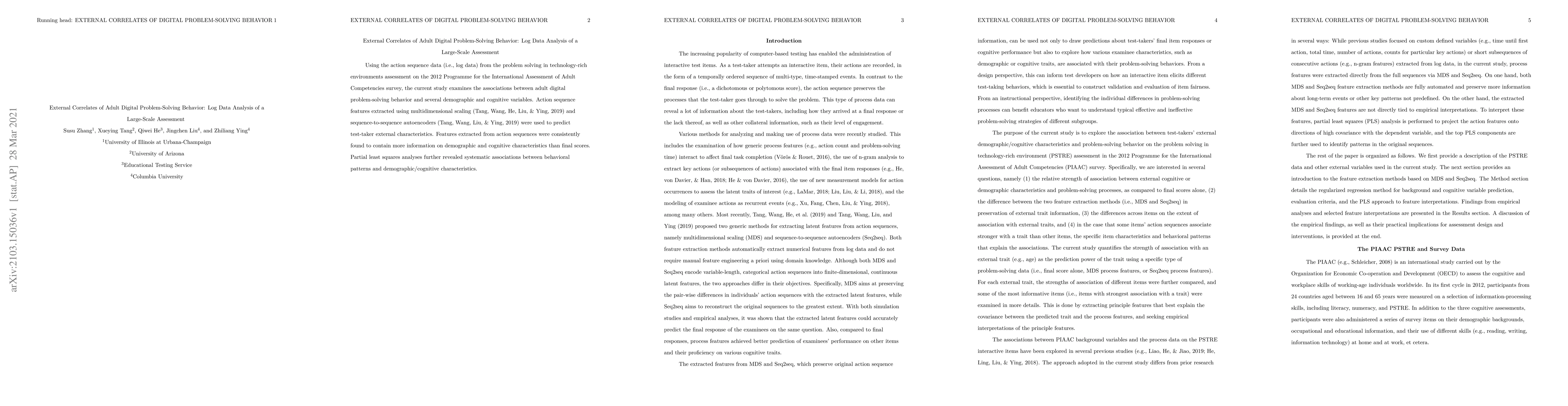 This study analyzes log data from a large-scale assessment to determine the relationship between adult digital problem-solving behavior and demographic/cognitive variables. Extracted features from action sequences provided more predictive information than final scores, revealing systematic associations through partial least squares analyses.
