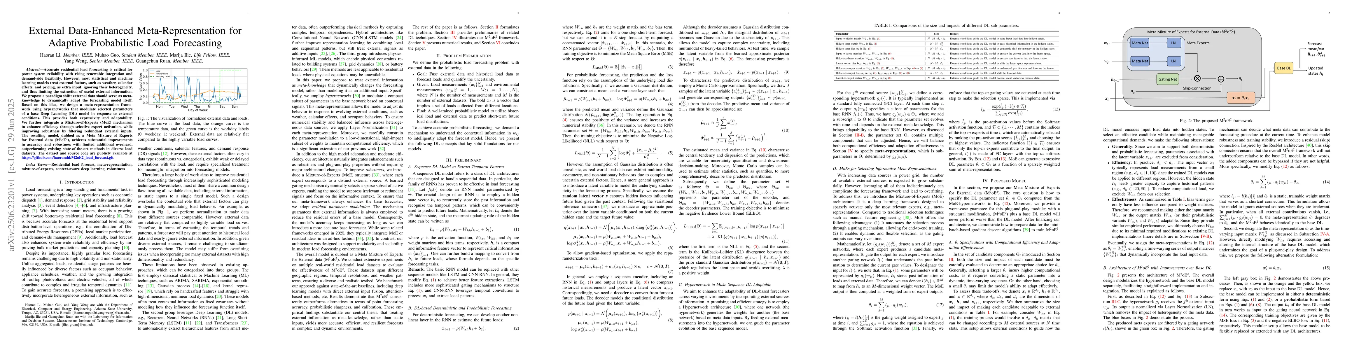 Accurate residential load forecasting is critical for power system reliability with rising renewable integration and demand-side flexibility. However, most statistical and machine learning models treat external factors, such as weather, calendar effects, and pricing, as extra input, ignoring their heterogeneity, and thus limiting the extraction of useful external information. We propose a paradigm shift: external data should serve as meta-knowledge to dynamically adapt the forecasting model itself. Based on this idea, we design a meta-representation framework using hypernetworks that modulate selected parameters of a base Deep Learning (DL) model in response to external conditions. This provides both expressivity and adaptability. We further integrate a Mixture-of-Experts (MoE) mechanism to enhance efficiency through selective expert activation, while improving robustness by filtering redundant external inputs. The resulting model, dubbed as a Meta Mixture of Experts for External data (M2oE2), achieves substantial improvements in accuracy and robustness with limited additional overhead, outperforming existing state-of-the-art methods in diverse load datasets. The dataset and source code are publicly available at https://github.com/haorandd/M2oE2\_load\_forecast.git.