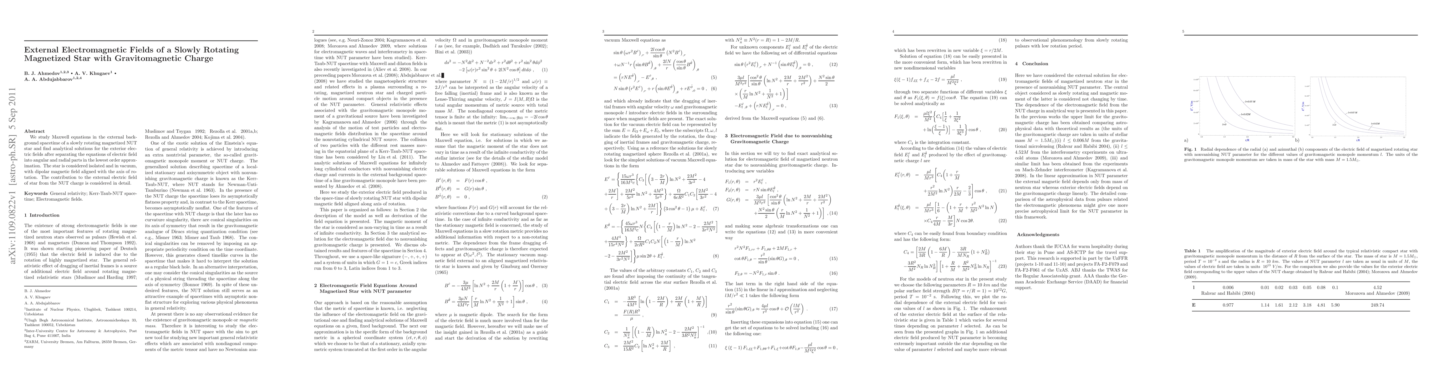 We study Maxwell equations in the external background spacetime of a slowly rotating magnetized NUT star and find analytical solutions for the exterior electric fields after separating the equations of electric field into angular and radial parts in the lowest order approximation. The star is considered isolated and in vacuum, with dipolar magnetic field aligned with the axis of rotation. The contribution to the external electric field of star from the NUT charge is considered in detail.