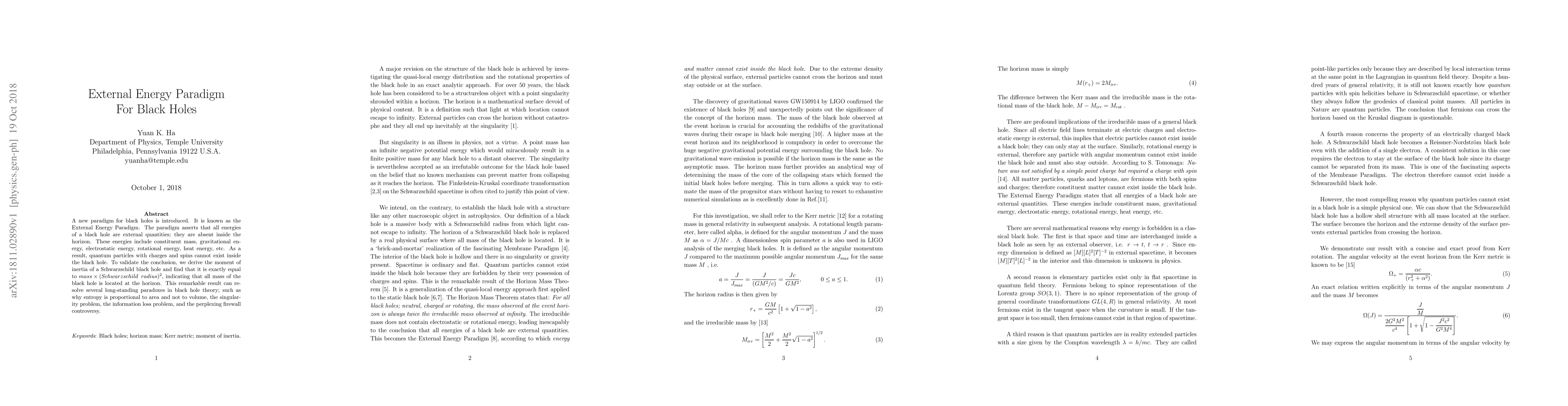 A new paradigm for black holes is introduced. It is known as the External Energy Paradigm. The paradigm asserts that all energies of a black hole are external quantities; they are absent inside the horizon. These energies include constituent mass, gravitational energy, electrostatic energy, rotational energy, heat energy, etc. As a result, quantum particles with charges and spins cannot exist inside the black hole. To validate the conclusion, we derive the moment of inertia of a Schwarzschild black hole and find that it is exactly equal to $mass \times (Schwarzschild \,\,\, radius)^{2}$, indicating that all mass of the black hole is located at the horizon. This remarkable result can resolve several long-standing paradoxes in black hole theory; such as why entropy is proportional to area and not to volume, the singularity problem, the information loss problem, and the perplexing firewall controversy.