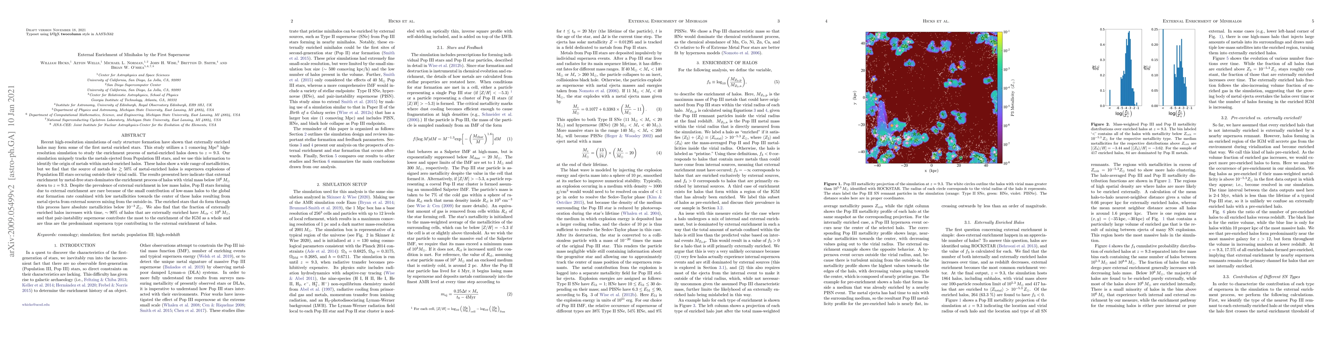 This study reveals that supernovae from Population III stars outside their virial radii significantly enrich metal-poor minihalos, contributing to the formation of the first metal-enriched stars. The research indicates that external enrichment dominates in low-mass halos ($<10^{6}\,M_\odot$) and increases over time, with pair-instability supernovae playing a key role in enriching the intergalactic medium.
