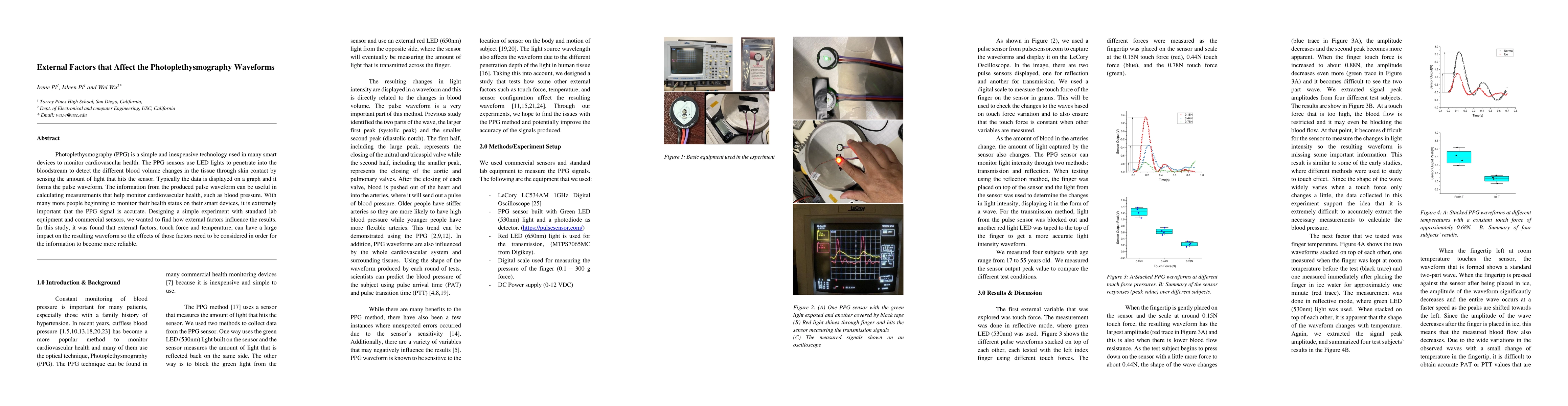 Photoplethysmography (PPG) is a simple and inexpensive technology used in many smart devices to monitor cardiovascular health. The PPG sensors use LED lights to penetrate into the bloodstream to detect the different blood volume changes in the tissue through skin contact by sensing the amount of light that hits the sensor. Typically the data is displayed on a graph and it forms the pulse waveform. The information from the produced pulse waveform can be useful in calculating measurements that help monitor cardiovascular health, such as blood pressure. With many more people beginning to monitor their health status on their smart devices, it is extremely important that the PPG signal is accurate. Designing a simple experiment with standard lab equipment and commercial sensors, we wanted to find how external factors influence the results. In this study, it was found that external factors, touch force and temperature, can have a large impact on the resulting waveform so the effects of those factors need to be considered in order for the information to become more reliable.