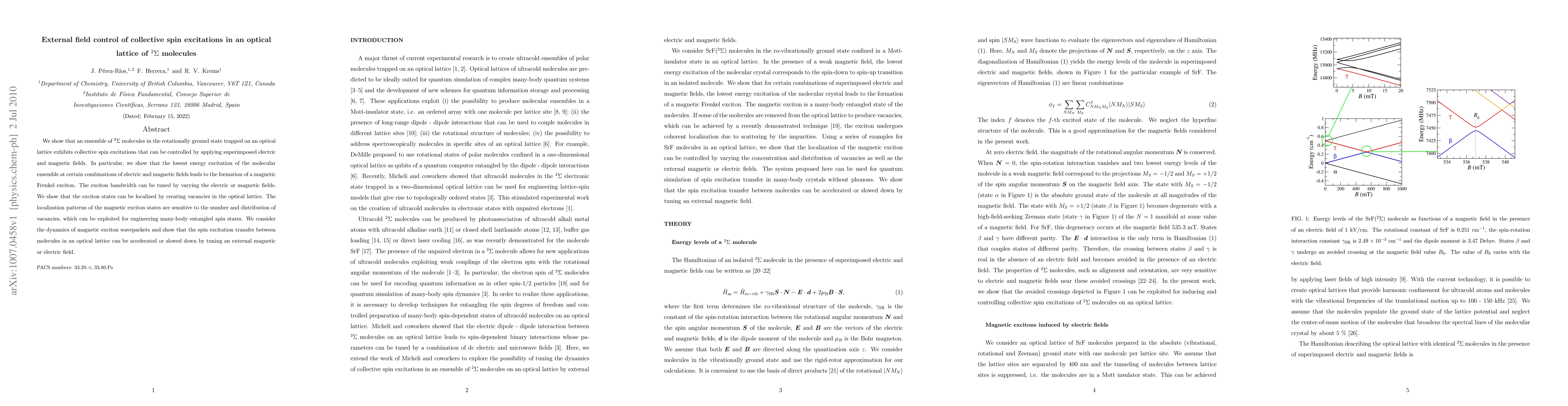 We show that an ensemble of $^2\Sigma$ molecules in the rotationally ground state trapped on an optical lattice exhibits collective spin excitations that can be controlled by applying superimposed electric and magnetic fields. In particular, we show that the lowest energy excitation of the molecular ensemble at certain combinations of electric and magnetic fields leads to the formation of a magnetic Frenkel exciton. The exciton bandwidth can be tuned by varying the electric or magnetic fields. We show that the exciton states can be localized by creating vacancies in the optical lattice. The localization patterns of the magnetic exciton states are sensitive to the number and distribution of vacancies, which can be exploited for engineering many-body entangled spin states. We consider the dynamics of magnetic exciton wavepackets and show that the spin excitation transfer between molecules in an optical lattice can be accelerated or slowed down by tuning an external magnetic or electric field.