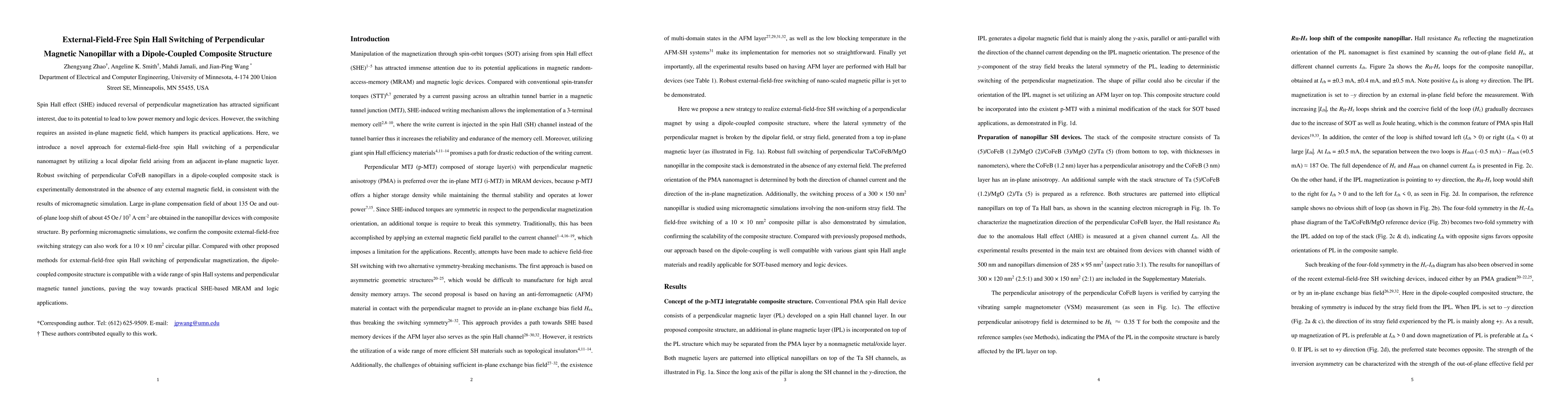 This paper demonstrates an external-field-free spin Hall switching technique for perpendicular nanomagnets using a dipole-coupled composite structure, achieving robust switching without an in-plane magnetic field. The method shows promising potential for low-power memory and logic devices.