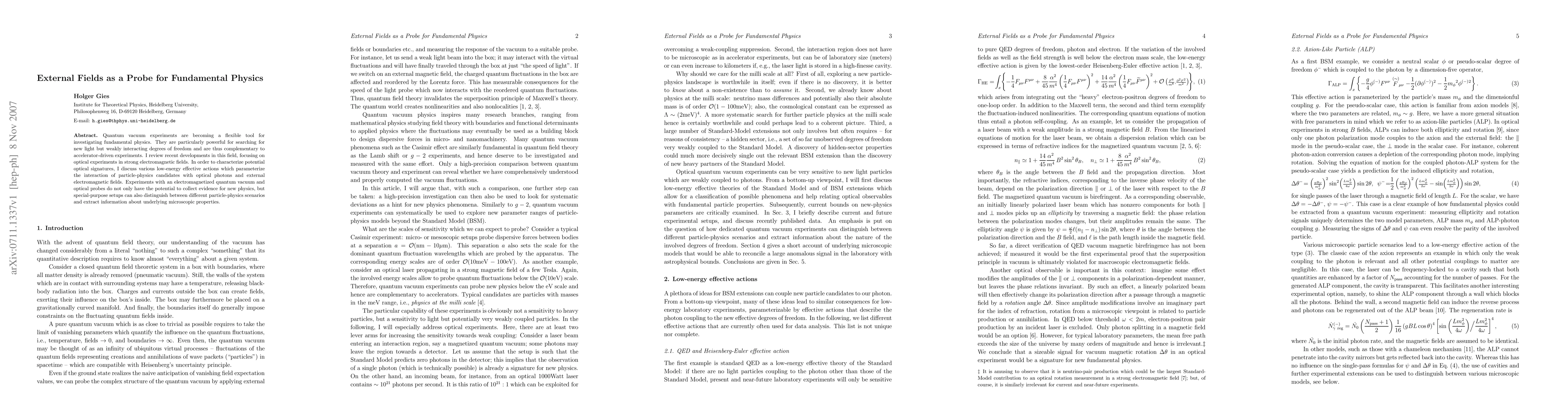 Quantum vacuum experiments are becoming a flexible tool for investigating fundamental physics. They are particularly powerful for searching for new light but weakly interacting degrees of freedom and are thus complementary to accelerator-driven experiments. I review recent developments in this field, focusing on optical experiments in strong electromagnetic fields. In order to characterize potential optical signatures, I discuss various low-energy effective actions which parameterize the interaction of particle-physics candidates with optical photons and external electromagnetic fields. Experiments with an electromagnetized quantum vacuum and optical probes do not only have the potential to collect evidence for new physics, but special-purpose setups can also distinguish between different particle-physics scenarios and extract information about underlying microscopic properties.