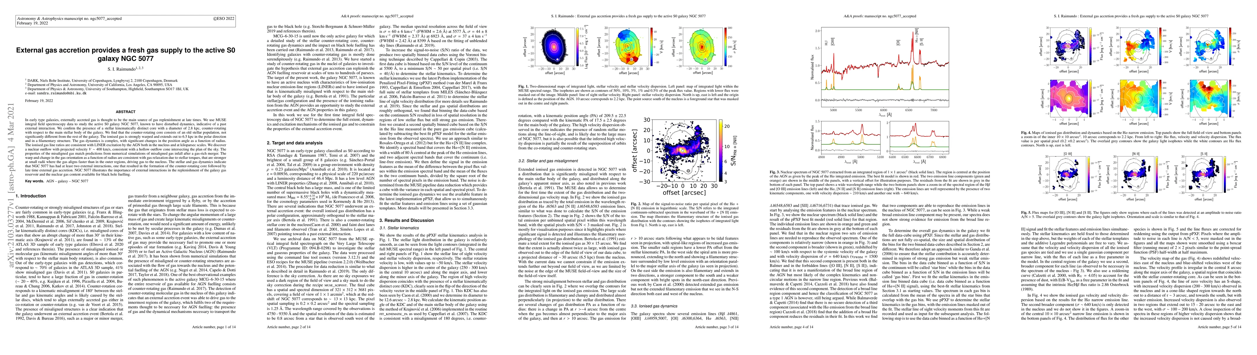 In early type galaxies, externally accreted gas is thought to be the main source of gas replenishment at late times. We use MUSE integral field spectroscopy data to study the active S0 galaxy NGC 5077, known to have disturbed dynamics, indicative of a past external interaction. We confirm the presence of a stellar kinematically distinct core with a diameter of 2.8 kpc, counter-rotating with respect to the main stellar body of the galaxy. We find that the counter-rotating core consists of an old stellar population, not significantly different from the rest of the galaxy. The ionised gas is strongly warped and extends out to 6.5 kpc in the polar direction and in a filamentary structure. The gas dynamics is complex, with significant changes in the position angle as a function of radius. The ionised gas line ratios are consistent with LINER excitation by the AGN both in the nucleus and at kiloparsec scales. We discover a nuclear outflow with projected velocity V ~ 400 km/s, consistent with a hollow outflow cone intersecting the plan of the sky. The properties of the misaligned gas match predictions from numerical simulations of misaligned gas infall after a gas-rich merger. The warp and change in the gas orientation as a function of radius are consistent with gas relaxation due to stellar torques, that are stronger at small radii where the gas aligns faster than in the outer regions, driving gas to the nucleus. The stellar and gas dynamics indicate that NGC 5077 has had at least two external interactions, one that resulted in the formation of the counter-rotating core followed by late time external gas accretion. NGC 5077 illustrates the importance of external interactions in the replenishment of the galaxy gas reservoir and the nuclear gas content available for black hole fuelling.