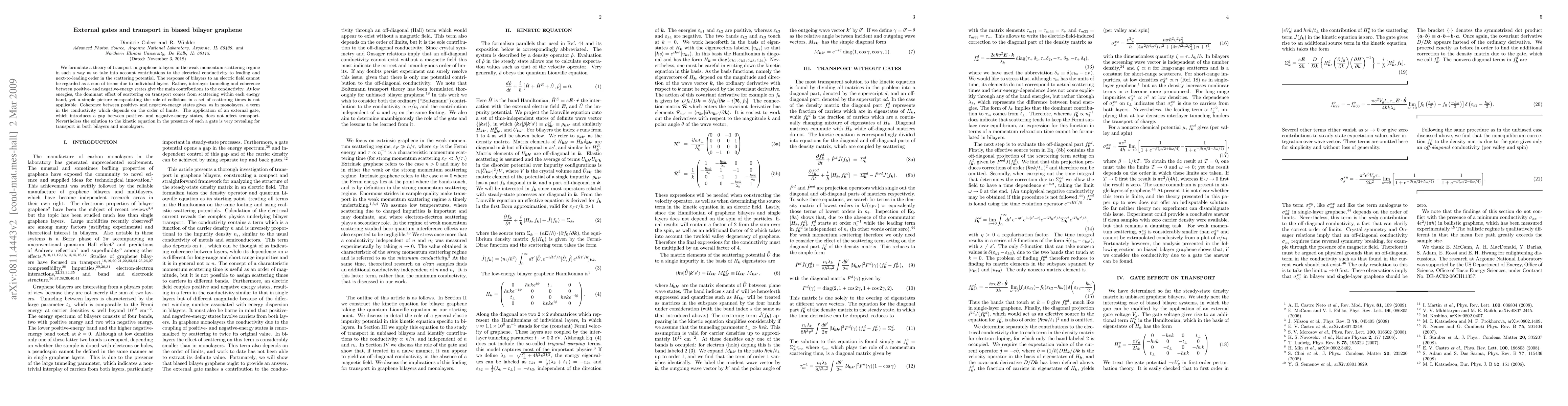 We formulate a theory of transport in graphene bilayers in the weak momentum scattering regime in such a way as to take into account contributions to the electrical conductivity to leading and next-to-leading order in the scattering potential. The response of bilayers to an electric field cannot be regarded as a sum of terms due to individual layers. Rather, interlayer tunneling and coherence between positive- and negative-energy states give the main contributions to the conductivity. At low energies, the dominant effect of scattering on transport comes from scattering within each energy band, yet a simple picture encapsulating the role of collisions in a set of scattering times is not applicable. Coherence between positive- and negative-energy states gives, as in monolayers, a term in the conductivity which depends on the order of limits. The application of an external gate, which introduces a gap between positive- and negative-energy states, does not affect transport. Nevertheless the solution to the kinetic equation in the presence of such a gate is very revealing for transport in both bilayers and monolayers.