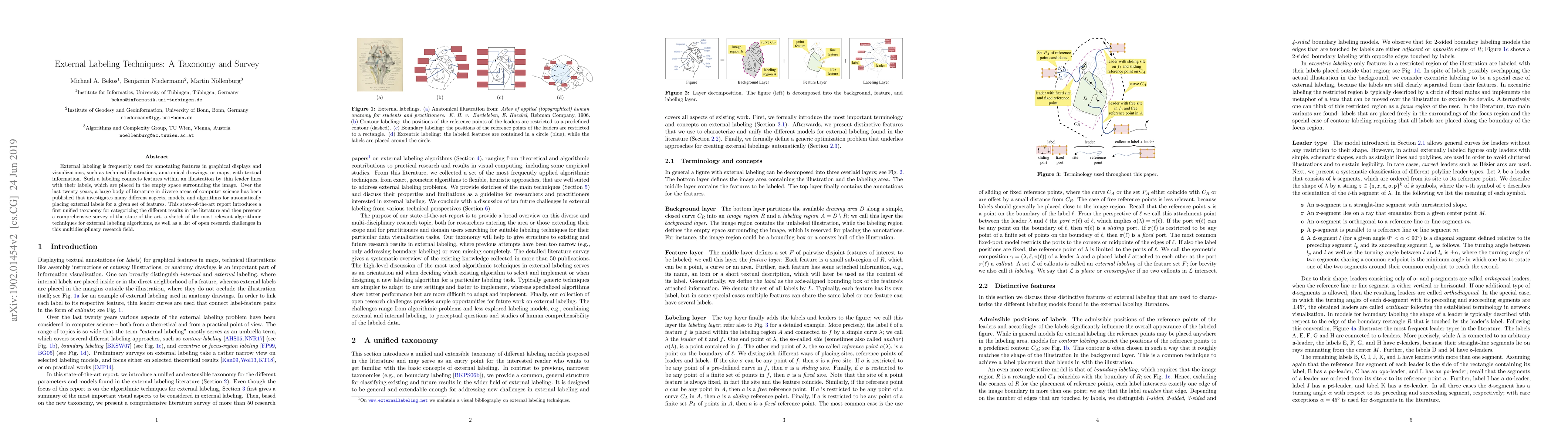This paper presents a unified taxonomy for categorizing external labeling techniques used in graphical displays, followed by a comprehensive survey of state-of-the-art methods and open research challenges in this multidisciplinary field.