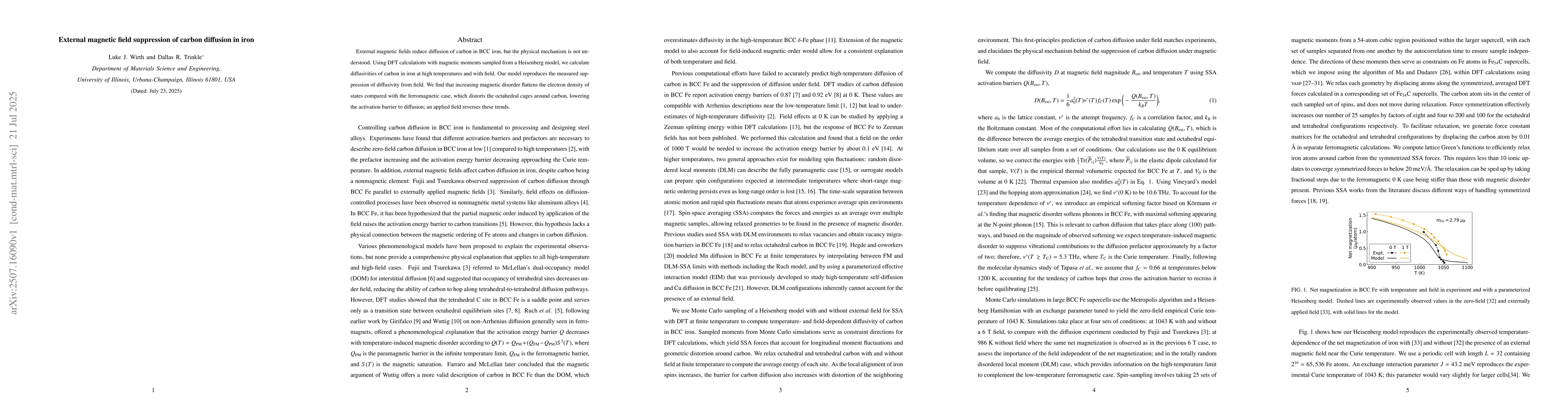External magnetic fields reduce diffusion of carbon in BCC iron, but the physical mechanism is not understood. Using DFT calculations with magnetic moments sampled from a Heisenberg model, we calculate diffusivities of carbon in iron at high temperatures and with field. Our model reproduces the measured suppression of diffusivity from field. We find that increasing magnetic disorder flattens the electron density of states compared with the ferromagnetic case, which distorts the octahedral cages around carbon, lowering the activation barrier to diffusion; an applied field reverses these trends.