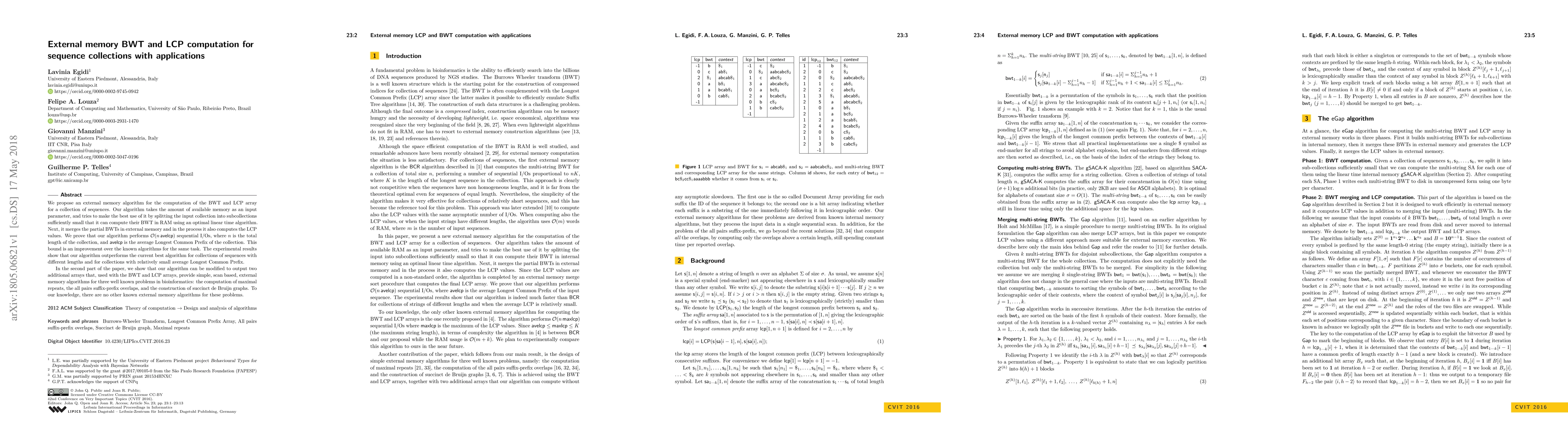 This paper presents an external memory algorithm for efficiently computing the BWT and LCP array for large sequence collections, optimizing memory usage and achieving better I/O performance. The algorithm also extends to solve three bioinformatics problems using additional arrays, offering the first external memory solutions for these tasks.