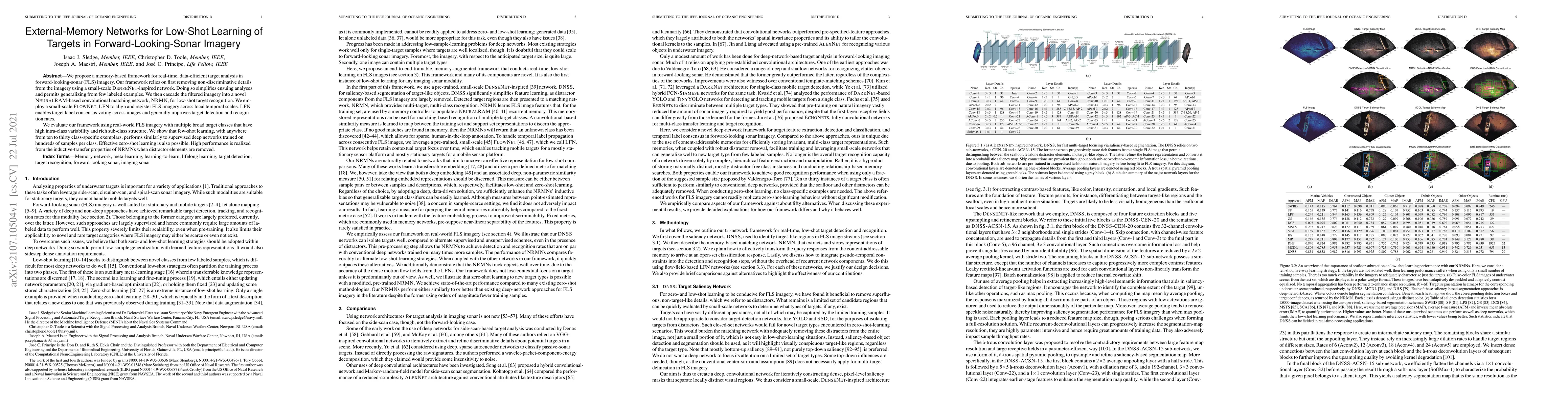 This paper proposes a memory-based framework for low-shot learning in forward-looking-sonar imagery, utilizing a DenseNet-inspired network to simplify imagery and a NeuralRAM-based convolutional matching network for target recognition. The approach achieves comparable performance to supervised networks trained on larger datasets.