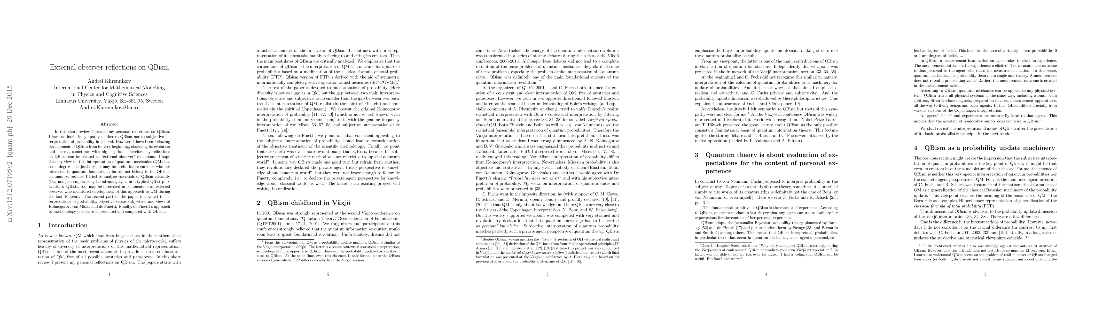 The paper presents reflections on QBism from an external observer's perspective, critically analyzing its essentials without sympathy towards QBism or subjective probability interpretations.