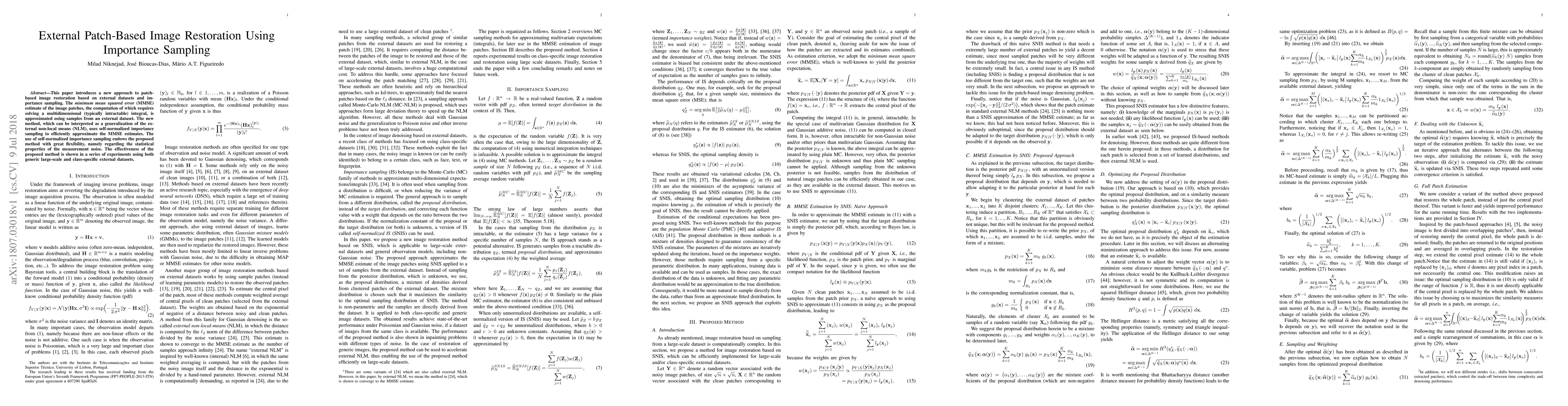 This paper proposes a novel patch-based image restoration technique leveraging external datasets and importance sampling to approximate Minimum Mean Squared Error estimates. The method uses self-normalized importance sampling for efficient computation, demonstrating flexibility in handling various noise conditions and effectiveness across different datasets.
