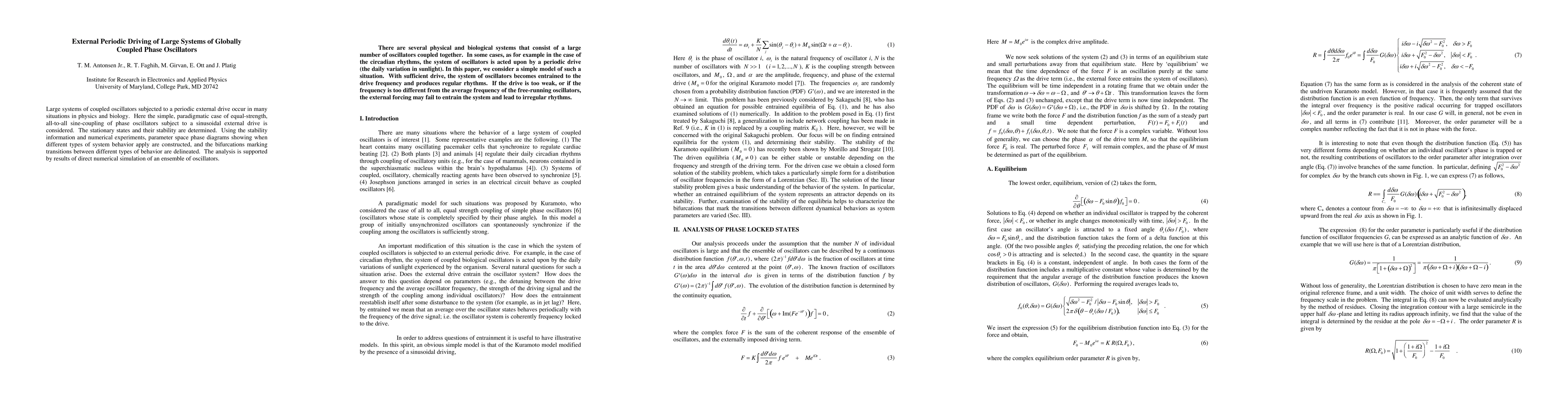 This paper investigates large systems of globally coupled phase oscillators driven by an external periodic force, determining their stationary states and stability. It constructs phase diagrams to illustrate transitions between different system behaviors, supported by numerical simulations.