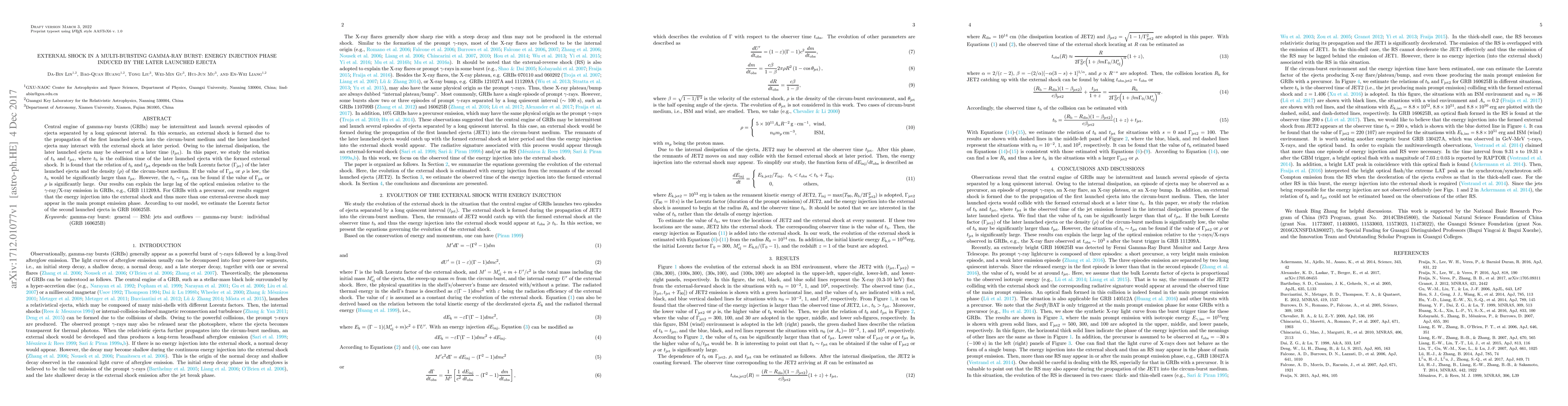 Central engine of gamma-ray bursts (GRBs) may be intermittent and launch several episodes of ejecta separated by a long quiescent interval. In this scenario, an external shock is formed due to the propagation of the first launched ejecta into the circum-burst medium and the later launched ejecta may interact with the external shock at later period. Owing to the internal dissipation, the later launched ejecta may be observed at a later time ($t_{\rm{jet}}$). In this paper, we study the relation of $t_{\rm{b}}$ and $t_{\rm{jet}}$, where $t_{\rm{b}}$ is the collision time of the later launched ejecta with the formed external shock. It is found that the relation of $t_{\rm{b}}$ and $t_{\rm{jet}}$ depends on the bulk Lorentz factor ($\Gamma_{\rm{jet}}$) of the later launched ejecta and the density ($\rho$) of the circum-burst medium. If the value of $\Gamma_{\rm{jet}}$ or $\rho$ is low, the $t_{\rm{b}}$ would be significantly larger than $t_{\rm{jet}}$. However, the $t_{\rm{b}}\sim t_{\rm{jet}}$ can be found if the value of $\Gamma_{\rm{jet}}$ or $\rho$ is significantly large. Our results can explain the large lag of the optical emission relative to the $\gamma$-ray/X-ray emission in GRBs, e.g., GRB~111209A. For GRBs with a precursor, our results suggest that the energy injection into the external shock and thus more than one external-reverse shock may appear in the main prompt emission phase. According to our model, we estimate the Lorentz factor of the second launched ejecta in GRB~160625B.