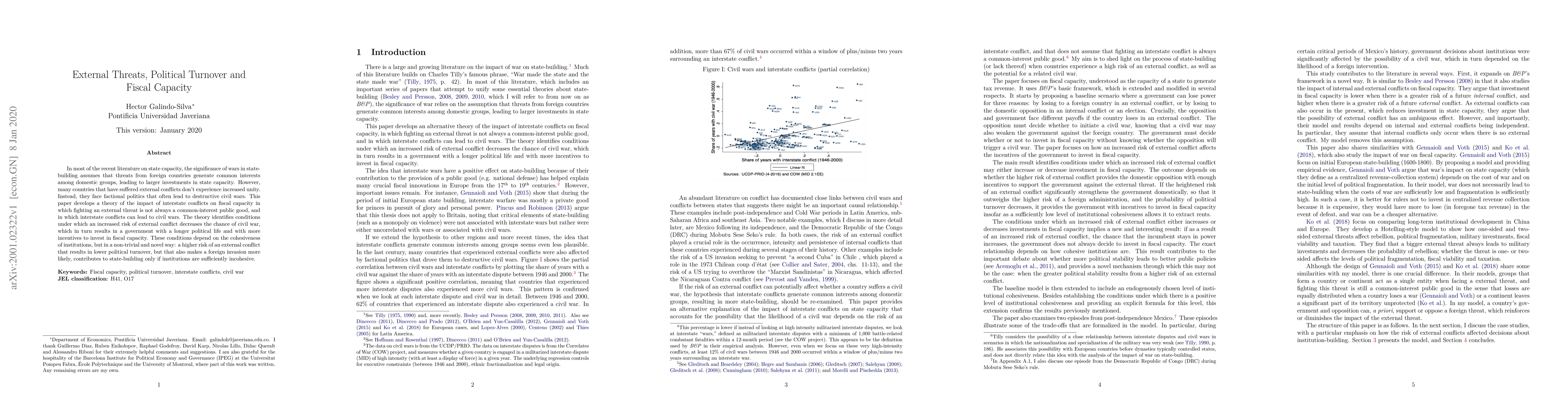 In most of the recent literature on state capacity, the significance of wars in state-building assumes that threats from foreign countries generate common interests among domestic groups, leading to larger investments in state capacity. However, many countries that have suffered external conflicts don't experience increased unity. Instead, they face factional politics that often lead to destructive civil wars. This paper develops a theory of the impact of interstate conflicts on fiscal capacity in which fighting an external threat is not always a common-interest public good, and in which interstate conflicts can lead to civil wars. The theory identifies conditions under which an increased risk of external conflict decreases the chance of civil war, which in turn results in a government with a longer political life and with more incentives to invest in fiscal capacity. These conditions depend on the cohesiveness of institutions, but in a non-trivial and novel way: a higher risk of an external conflict that results in lower political turnover, but that also makes a foreign invasion more likely, contributes to state-building only if institutions are sufficiently incohesive.