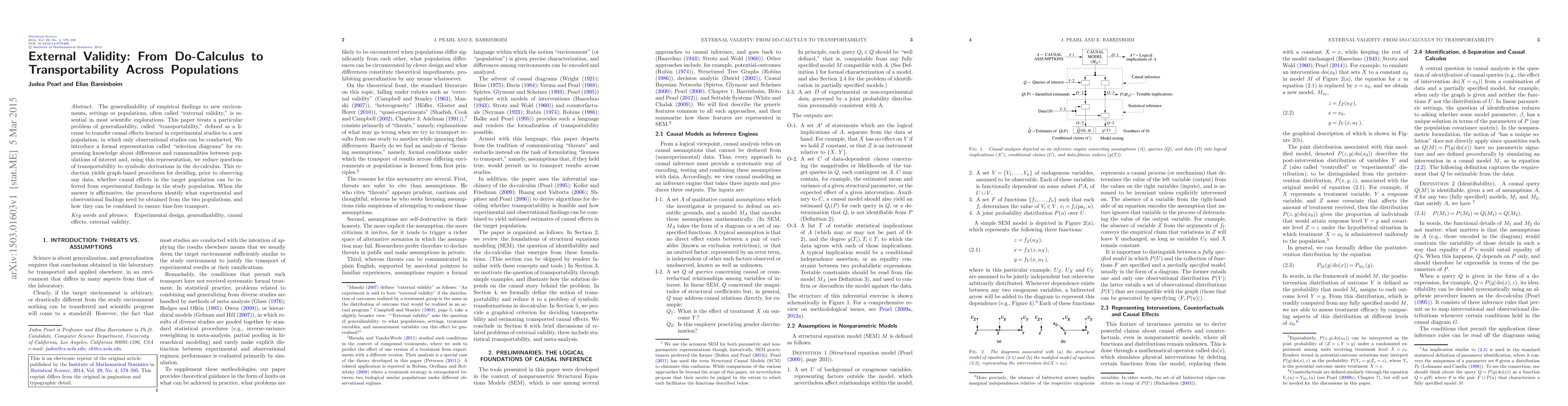 This paper explores the concept of "transportability" to generalize causal effects from experimental studies to new populations, introducing "selection diagrams" to represent population differences. It uses do-calculus to derive graph-based procedures for determining if and how causal effects can be transferred, outlining necessary data from both populations for unbiased inference.