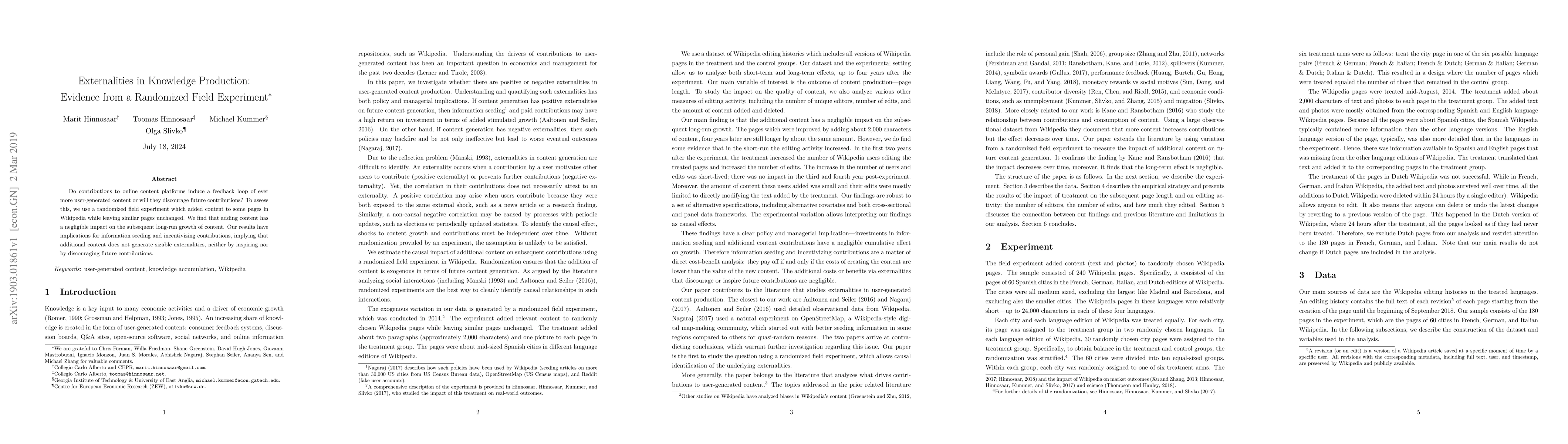 Summary: A randomized field experiment on Wikipedia found negligible long-term impact from adding content, suggesting that current knowledge contributions do not significantly inspire or deter future contributions, thus indicating minimal positive or negative externalities in knowledge production.