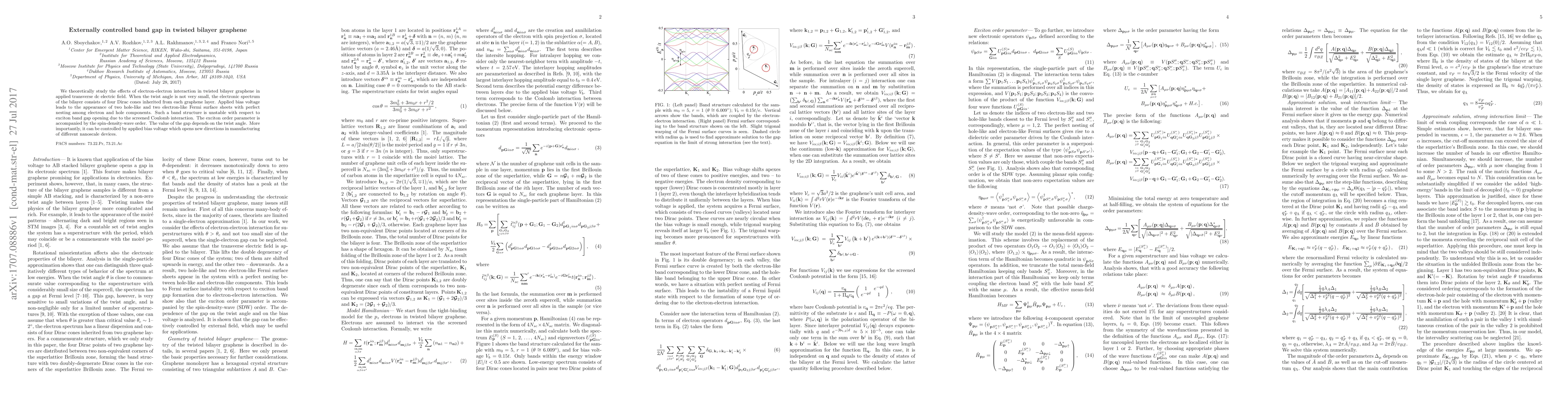 This paper theoretically explores how electron-electron interactions in twisted bilayer graphene under a transverse electric field can lead to an externally controlled band gap. The applied bias voltage induces a spin-density-wave order and a tunable exciton band gap, which can be manipulated by the twist angle and bias voltage, offering potential for nanoscale device applications.
