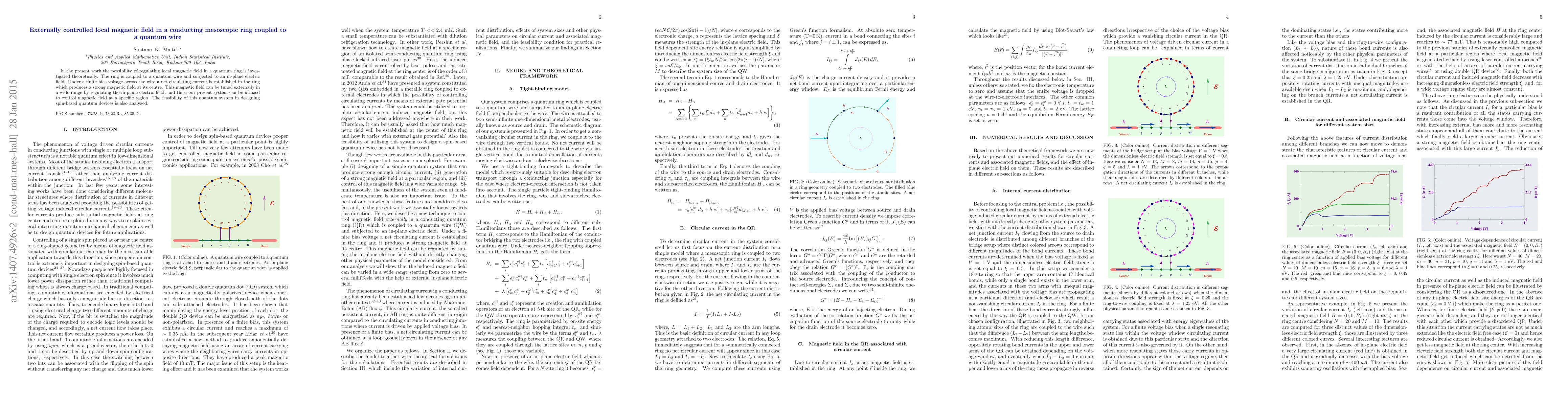 This paper investigates a quantum ring coupled to a quantum wire, where an in-plane electric field can externally regulate the local magnetic field at the ring's center. The study explores the potential of this system to control magnetic fields for designing spin-based quantum devices.