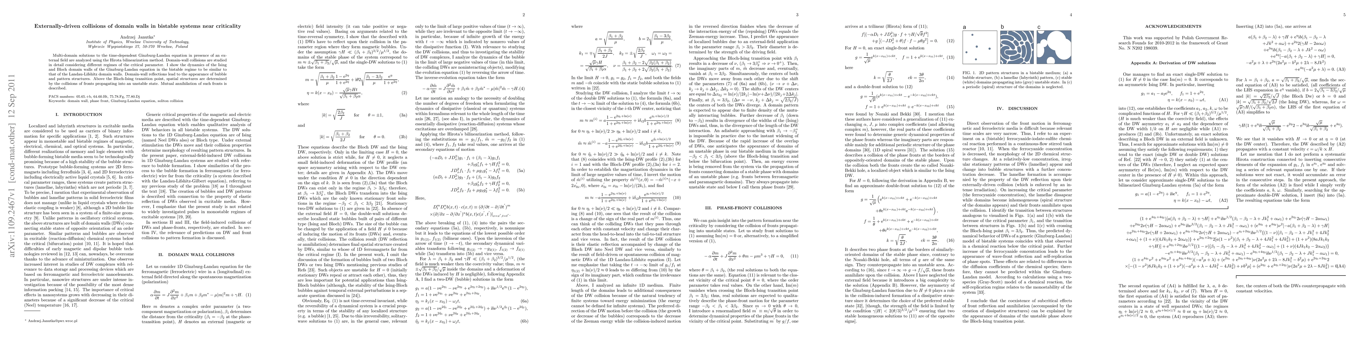 Researchers studied domain wall collisions in bistable systems near criticality using the Hirota bilinearization method, finding similarities with Landau-Lifshitz dynamics and the emergence of bubble and pattern structures.