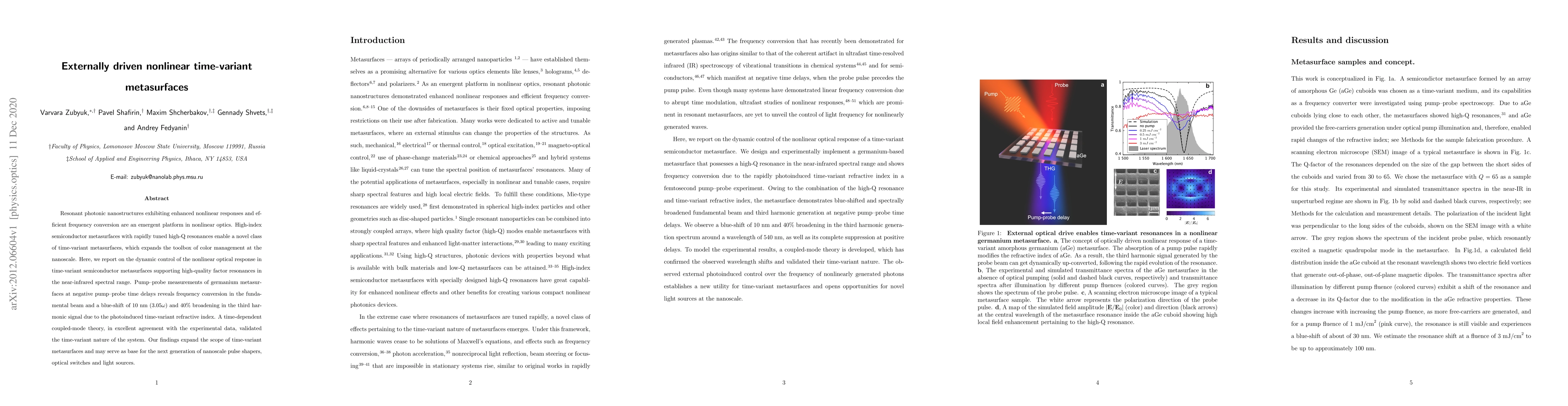 This paper explores the dynamic control of nonlinear optical responses in high-index semiconductor metasurfaces, demonstrating efficient frequency conversion and a photoinduced time-variant refractive index. The study uses germanium metasurfaces to achieve a blue-shift and broadening in harmonic signals, suggesting potential applications in nanoscale optical devices.