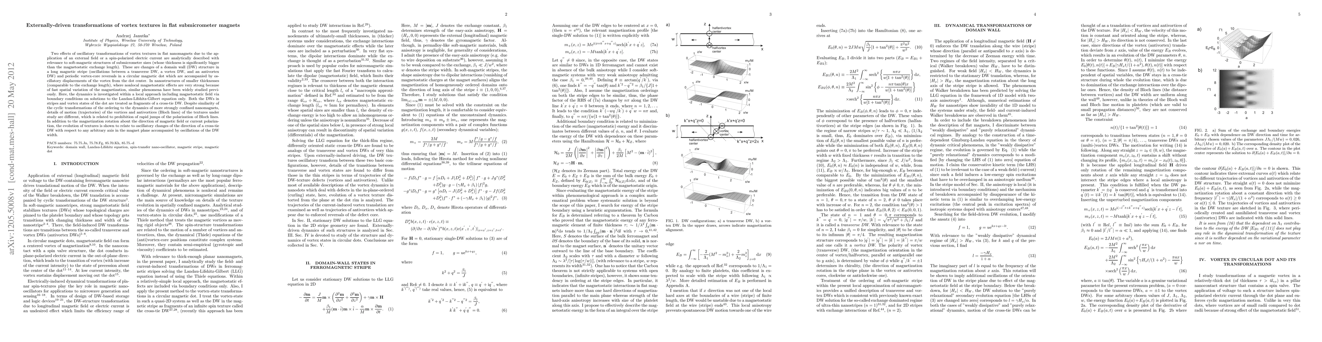 Two effects of oscillatory transformations of vortex textures in flat nanomagnets due to the application of an external field or a spin-polarized electric current are analytically described with relevance to soft-magnetic structures of submicrometer sizes (whose thickness is significantly bigger than the magnetostatic exchange length). These are changes of a domain wall (DW) structure in a long magnetic stripe (oscillations between a transverse DW, a vortex DW, and an antivortex DW) and periodic vortex-core reversals in a circular magnetic dot which are accompanied by oscillatory displacements of the vortex from the dot center. In nanostructures of smaller thicknesses (comparable to the exchange length), where nonlocal magnetostatic effects are very strong because of fast spatial variation of the magnetization, similar phenomena have been widely studied previously. Here, the dynamics is investigated within a local approach including magnetostatic field via boundary conditions on solutions to the Landau-Lifshitz-Gilbert equation only. Both the DWs in stripes and vortex states of the dot are treated as fragments of a cross-tie DW. Despite similarity of the cyclic transformations of the ordering to the dynamics of more strongly confined nanomagnets, details of motion (trajectories) of the vortices and antivortices (Bloch lines) of the textures under study are different, which is related to prohibition of rapid jumps of the polarization of Bloch lines. In addition to the magnetization rotation about the direction of magnetic field or current polarization, the evolution of textures is shown to relate to oscillatory changes of the direction of a cross-tie DW with respect to any arbitrary axis in the magnet plane accompanied by oscillations of the DW width.