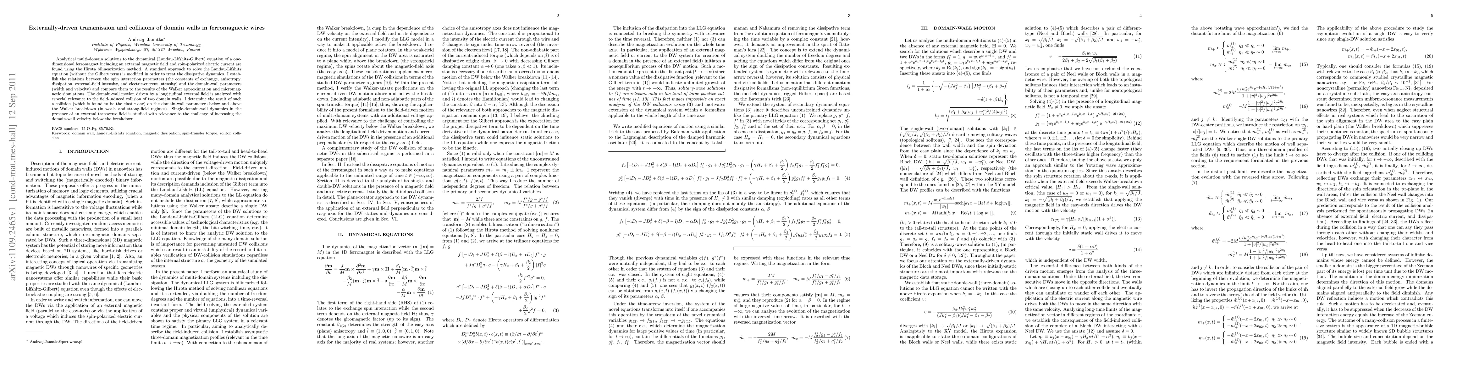 This research paper analyzes domain wall motion in ferromagnetic wires driven by external magnetic fields and electric currents, providing insights into collision dynamics and velocity enhancement below a critical threshold.