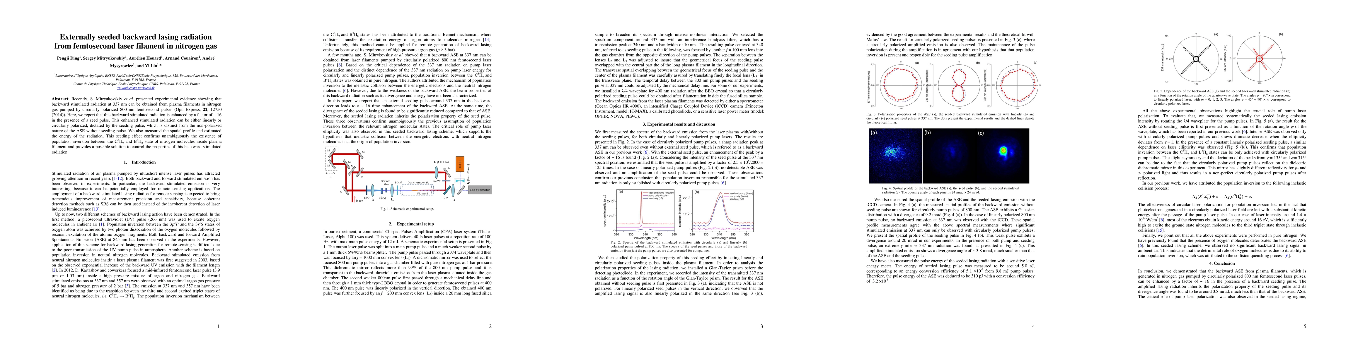 This paper reports that externally seeded pulses enhance backward stimulated radiation in nitrogen gas filaments, confirming population inversion between specific nitrogen molecular states and providing a method to control the polarization of the radiation. The seeding pulse increases the radiation by a factor of 16 and alters its spatial profile and energy.