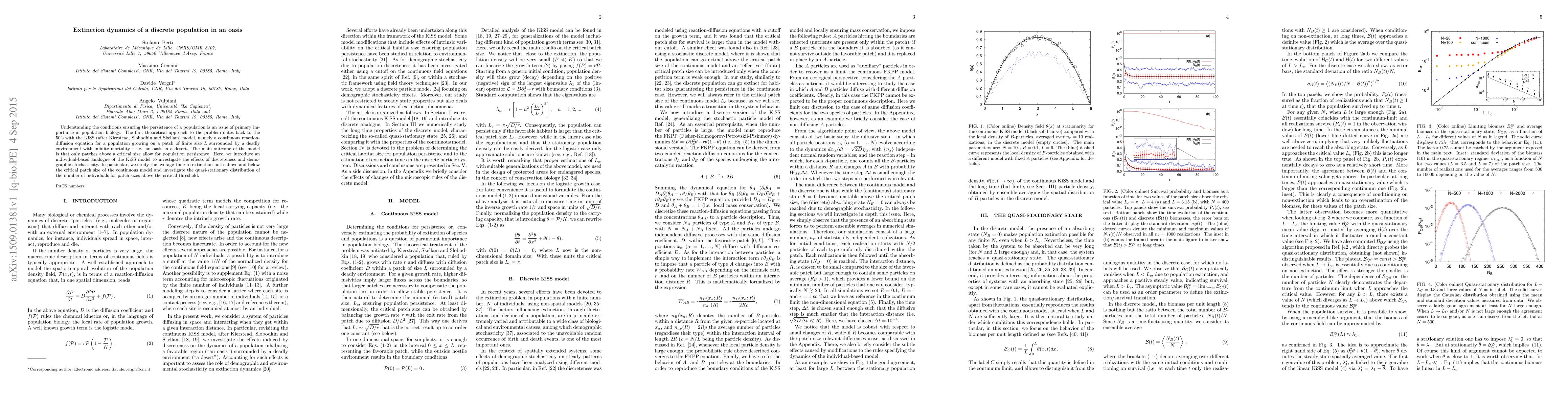 This paper introduces an individual-based model to study the extinction dynamics of a population in a discrete oasis, comparing it to the continuous KiSS model. It focuses on the average time to extinction and quasi-stationary distribution of individuals, particularly above and below the critical patch size for population persistence.